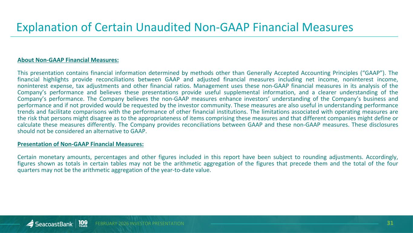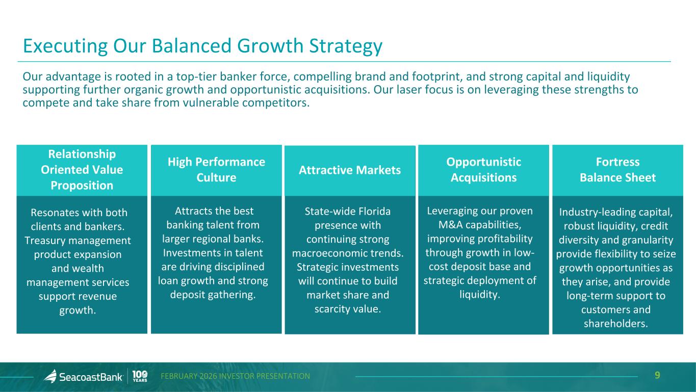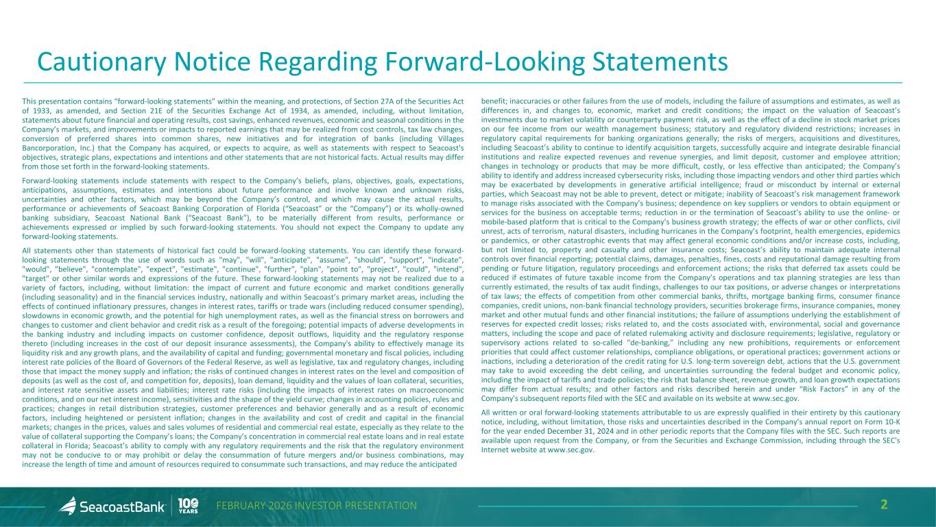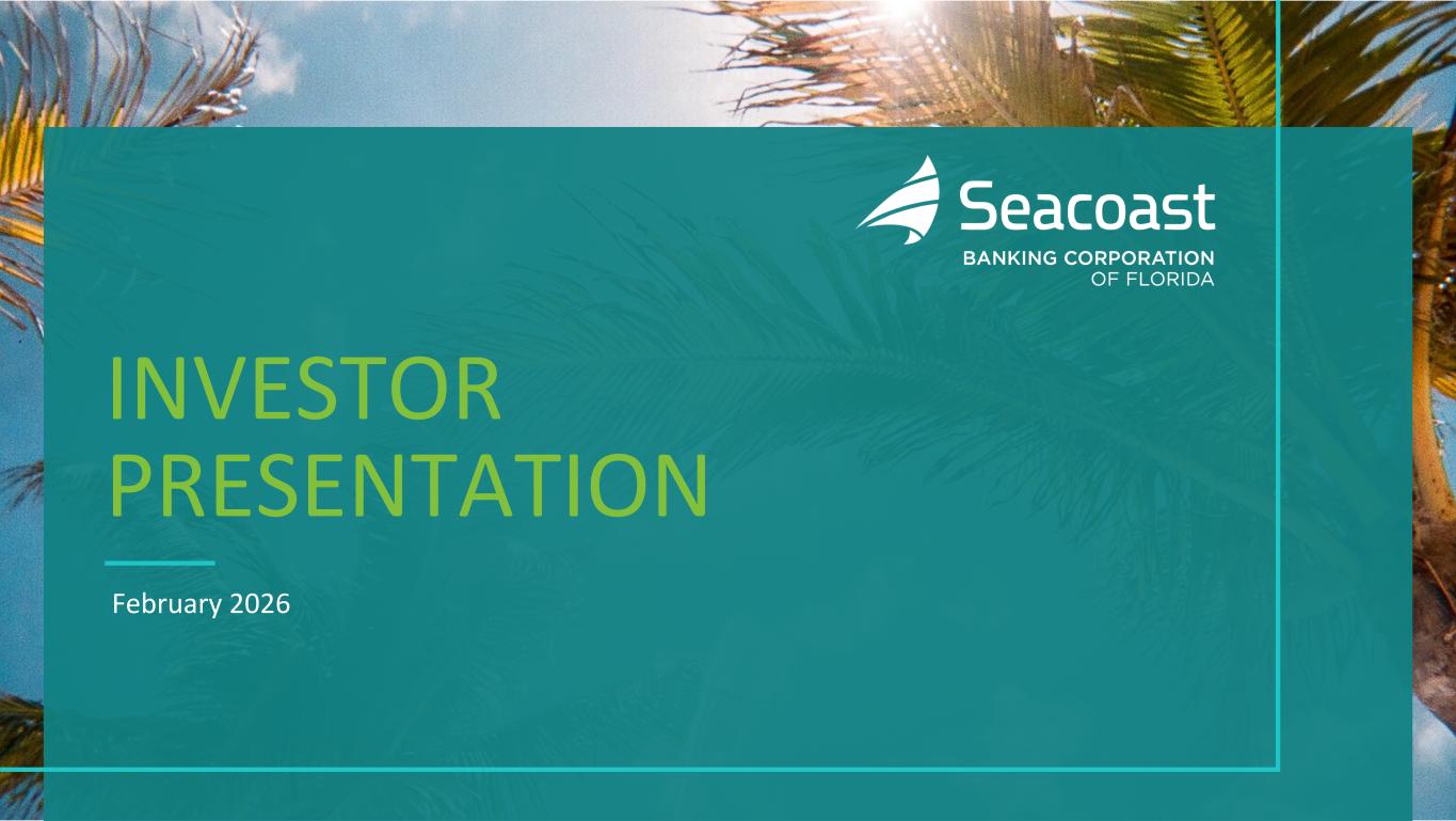2FEBRUARY 2026 INVESTOR PRESENTATION Cautionary Notice Regarding Forward-Looking Statements This presentation contains “forward-looking statements” within the meaning, and protections, of Section 27A of the Securities Act of 1933, as amended, and Section 21E of the Securities Exchange Act of 1934, as amended, including, without limitation, statements about future financial and operating results, cost savings, enhanced revenues, economic and seasonal conditions in the Company’s markets, and improvements or impacts to reported earnings that may be realized from cost controls, tax law changes, conversion of preferred shares into common shares, new initiatives and for integration of banks (including Villages Bancorporation, Inc.) that the Company has acquired, or expects to acquire, as well as statements with respect to Seacoast's objectives, strategic plans, expectations and intentions and other statements that are not historical facts. Actual results may differ from those set forth in the forward-looking statements. Forward-looking statements include statements with respect to the Company’s beliefs, plans, objectives, goals, expectations, anticipations, assumptions, estimates and intentions about future performance and involve known and unknown risks, uncertainties and other factors, which may be beyond the Company’s control, and which may cause the actual results, performance or achievements of Seacoast Banking Corporation of Florida (“Seacoast” or the “Company”) or its wholly-owned banking subsidiary, Seacoast National Bank (“Seacoast Bank”), to be materially different from results, performance or achievements expressed or implied by such forward-looking statements. You should not expect the Company to update any forward-looking statements. All statements other than statements of historical fact could be forward-looking statements. You can identify these forward- looking statements through the use of words such as "may", "will", "anticipate", "assume", "should", "support", "indicate", "would", "believe", "contemplate", "expect", "estimate", "continue", "further", "plan", "point to", "project", "could", "intend", "target" or other similar words and expressions of the future. These forward-looking statements may not be realized due to a variety of factors, including, without limitation: the impact of current and future economic and market conditions generally (including seasonality) and in the financial services industry, nationally and within Seacoast’s primary market areas, including the effects of continued inflationary pressures, changes in interest rates, tariffs or trade wars (including reduced consumer spending), slowdowns in economic growth, and the potential for high unemployment rates, as well as the financial stress on borrowers and changes to customer and client behavior and credit risk as a result of the foregoing; potential impacts of adverse developments in the banking industry and including impacts on customer confidence, deposit outflows, liquidity and the regulatory response thereto (including increases in the cost of our deposit insurance assessments), the Company's ability to effectively manage its liquidity risk and any growth plans, and the availability of capital and funding; governmental monetary and fiscal policies, including interest rate policies of the Board of Governors of the Federal Reserve, as well as legislative, tax and regulatory changes, including those that impact the money supply and inflation; the risks of continued changes in interest rates on the level and composition of deposits (as well as the cost of, and competition for, deposits), loan demand, liquidity and the values of loan collateral, securities, and interest rate sensitive assets and liabilities; interest rate risks (including the impacts of interest rates on macroeconomic conditions, and on our net interest income), sensitivities and the shape of the yield curve; changes in accounting policies, rules and practices; changes in retail distribution strategies, customer preferences and behavior generally and as a result of economic factors, including heightened or persistent inflation; changes in the availability and cost of credit and capital in the financial markets; changes in the prices, values and sales volumes of residential and commercial real estate, especially as they relate to the value of collateral supporting the Company’s loans; the Company’s concentration in commercial real estate loans and in real estate collateral in Florida; Seacoast’s ability to comply with any regulatory requirements and the risk that the regulatory environment may not be conducive to or may prohibit or delay the consummation of future mergers and/or business combinations, may increase the length of time and amount of resources required to consummate such transactions, and may reduce the anticipated benefit; inaccuracies or other failures from the use of models, including the failure of assumptions and estimates, as well as differences in, and changes to, economic, market and credit conditions; the impact on the valuation of Seacoast’s investments due to market volatility or counterparty payment risk, as well as the effect of a decline in stock market prices on our fee income from our wealth management business; statutory and regulatory dividend restrictions; increases in regulatory capital requirements for banking organizations generally; the risks of mergers, acquisitions and divestitures, including Seacoast’s ability to continue to identify acquisition targets, successfully acquire and integrate desirable financial institutions and realize expected revenues and revenue synergies, and limit deposit, customer and employee attrition; changes in technology or products that may be more difficult, costly, or less effective than anticipated; the Company’s ability to identify and address increased cybersecurity risks, including those impacting vendors and other third parties wh