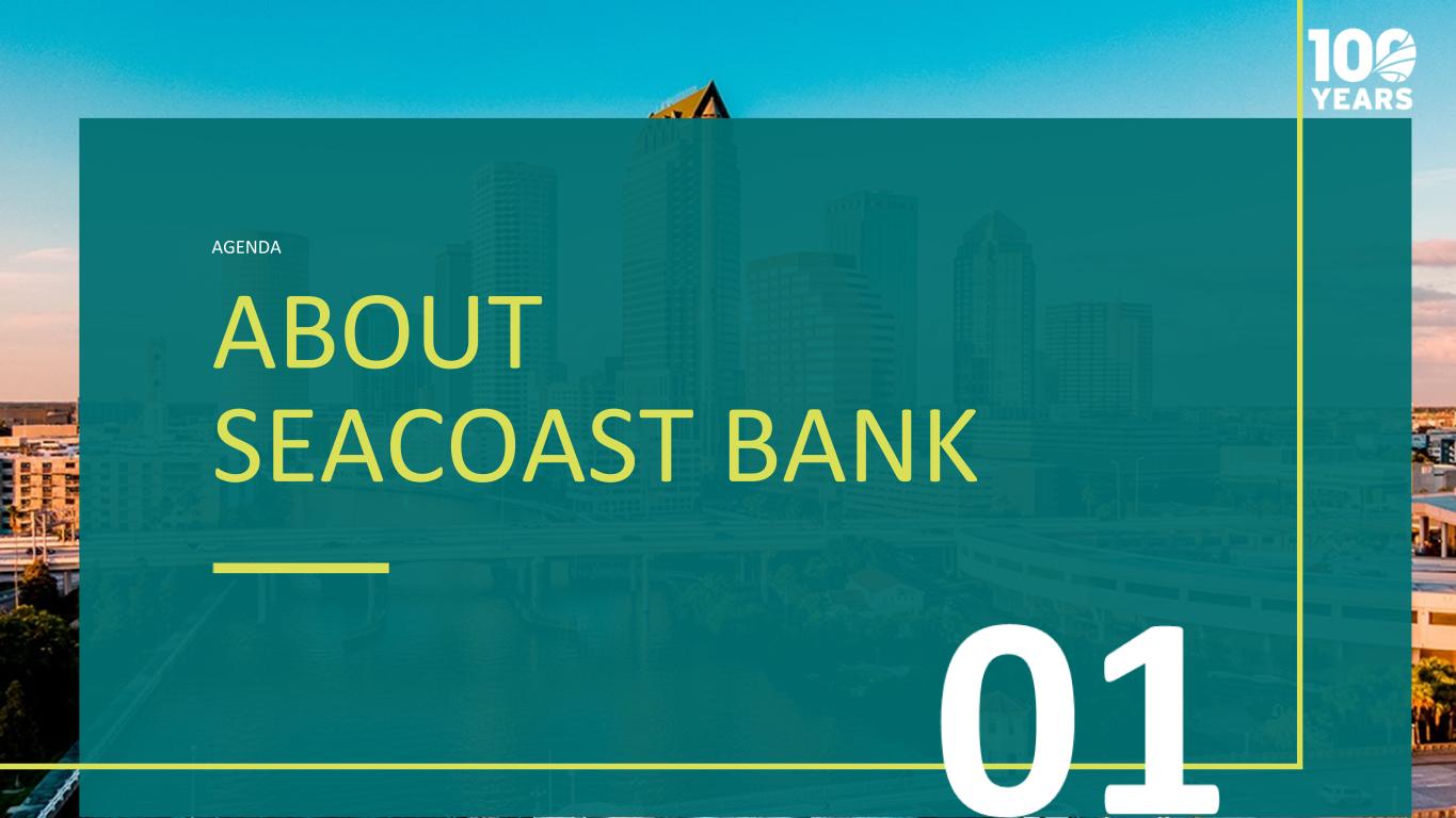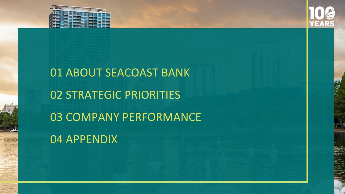 01 ABOUT SEACOAST BANK 02 STRATEGIC PRIORITIES 03 COMPANY PERFORMANCE 04 APPENDIX