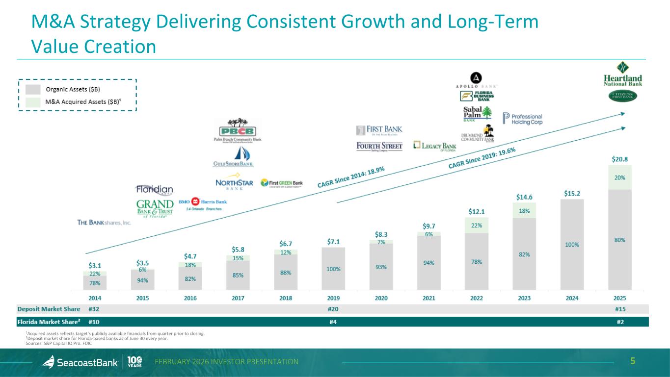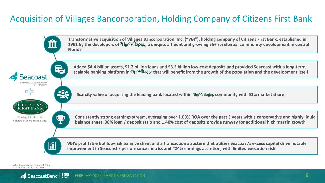 5FEBRUARY 2026 INVESTOR PRESENTATION M&A Strategy Delivering Consistent Growth and Long-Term Value Creation 1Acquired assets reflects target’s publicly available financials from quarter prior to closing. 2Deposit market share for Florida-based banks as of June 30 every year. Sources: S&P Capital IQ Pro. FDIC