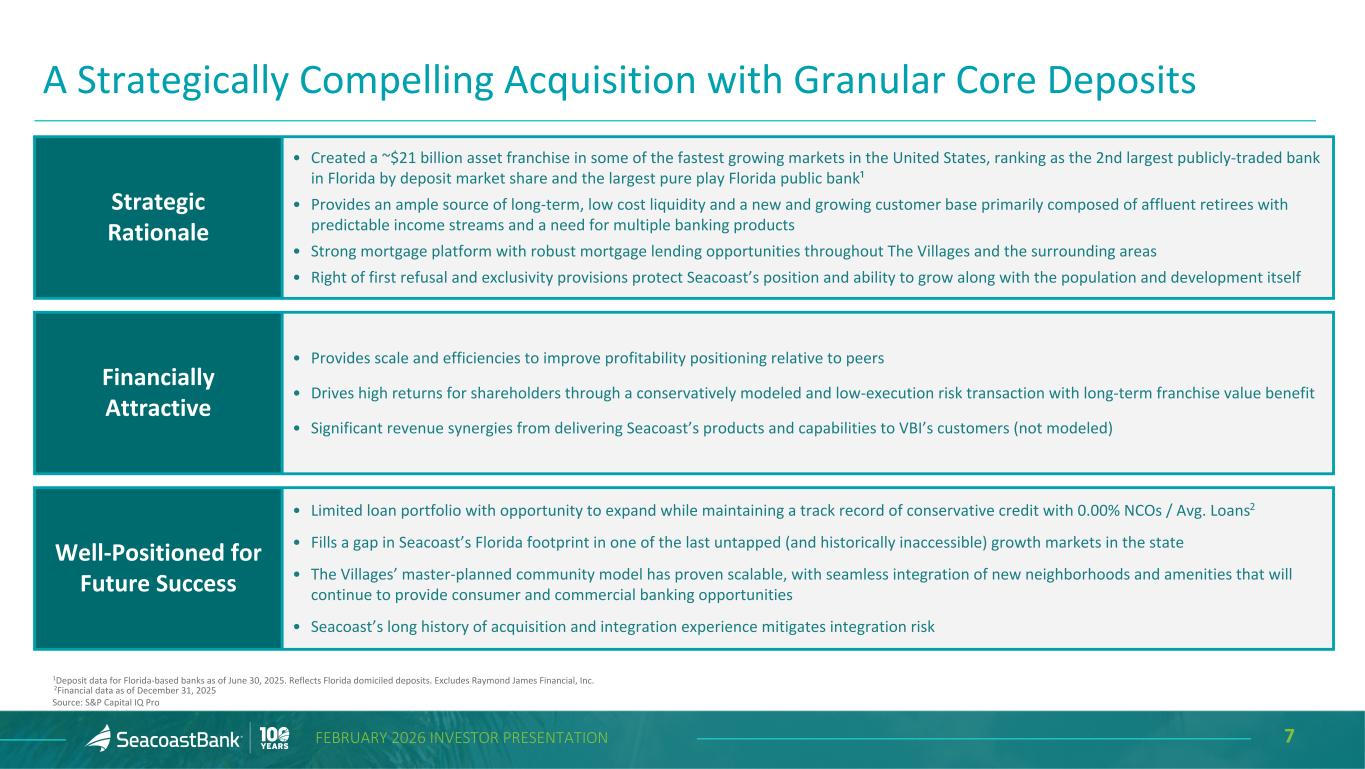 6FEBRUARY 2026 INVESTOR PRESENTATION Acquisition of Villages Bancorporation, Holding Company of Citizens First Bank Note: Deposit data as of June 30, 2025 Sources: S&P Capital IQ Pro. FDIC Transformative acquisition of Villages Bancorporation, Inc. (“VBI”), holding company of Citizens First Bank, established in 1991 by the developers of , a unique, affluent and growing 55+ residential community development in central Florida Added $4.4 billion assets, $1.2 billion loans and $3.5 billion low-cost deposits and provided Seacoast with a long-term, scalable banking platform in that will benefit from the growth of the population and the development itself Scarcity value of acquiring the leading bank located within community with 51% market share VBI’s profitable but low-risk balance sheet and a transaction structure that utilizes Seacoast’s excess capital drive notable improvement in Seacoast’s performance metrics and ~24% earnings accretion, with limited execution risk Consistently strong earnings stream, averaging over 1.00% ROA over the past 5 years with a conservative and highly liquid balance sheet: 38% loan / deposit ratio and 1.40% cost of deposits provide runway for additional high margin growth Banking Subsidiary of Villages Bancorporation, Inc.