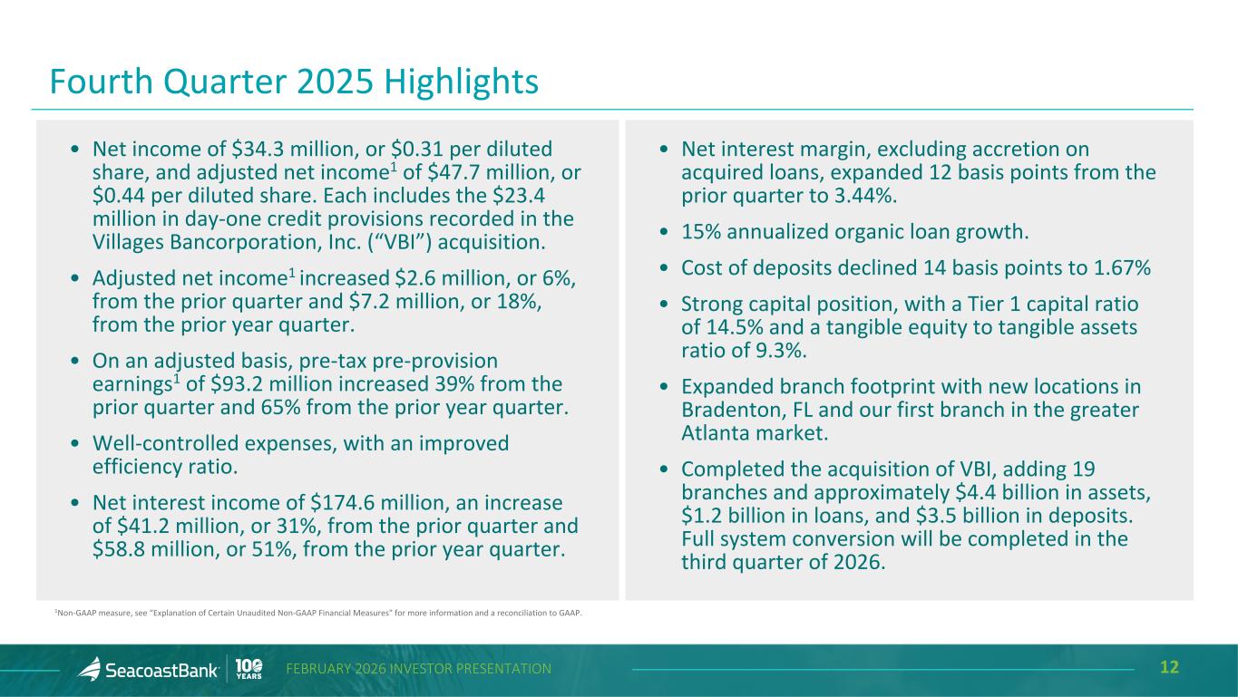 11FEBRUARY 2026 INVESTOR PRESENTATION • Sustained, strong presence in Florida’s most attractive markets • #15 Florida market share ▪ #1 Florida-based bank in Orlando MSA ▪ #1 Florida-based bank in Palm Beach, Highlands, and 10 other counties ▪ #1 overall market share in Port St. Lucie MSA ▪ #1 overall market share in Wildwood- The Villages MSA • Strong capital and liquidity supporting further organic growth and opportunistic acquisitions ▪ 14.5% Tier 1 capital ratio ▪ 78% loan-to-deposit ratio Valuable Florida Franchise with Strong Capital and Liquidity