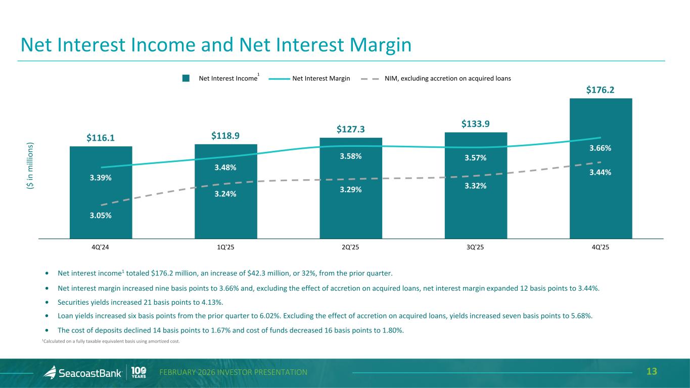12FEBRUARY 2026 INVESTOR PRESENTATION • Net income of $34.3 million, or $0.31 per diluted share, and adjusted net income1 of $47.7 million, or $0.44 per diluted share. Each includes the $23.4 million in day-one credit provisions recorded in the Villages Bancorporation, Inc. (“VBI”) acquisition. • Adjusted net income1 increased $2.6 million, or 6%, from the prior quarter and $7.2 million, or 18%, from the prior year quarter. • On an adjusted basis, pre-tax pre-provision earnings1 of $93.2 million increased 39% from the prior quarter and 65% from the prior year quarter. • Well-controlled expenses, with an improved efficiency ratio. • Net interest income of $174.6 million, an increase of $41.2 million, or 31%, from the prior quarter and $58.8 million, or 51%, from the prior year quarter. Fourth Quarter 2025 Highlights • Net interest margin, excluding accretion on acquired loans, expanded 12 basis points from the prior quarter to 3.44%. • 15% annualized organic loan growth. • Cost of deposits declined 14 basis points to 1.67% • Strong capital position, with a Tier 1 capital ratio of 14.5% and a tangible equity to tangible assets ratio of 9.3%. • Expanded branch footprint with new locations in Bradenton, FL and our first branch in the greater Atlanta market. • Completed the acquisition of VBI, adding 19 branches and approximately $4.4 billion in assets, $1.2 billion in loans, and $3.5 billion in deposits. Full system conversion will be completed in the third quarter of 2026. 1Non-GAAP measure, see “Explanation of Certain Unaudited Non-GAAP Financial Measures" for more information and a reconciliation to GAAP.