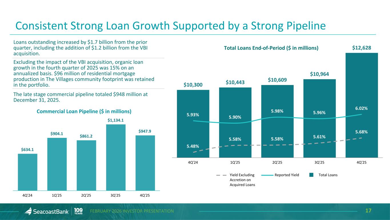 16FEBRUARY 2026 INVESTOR PRESENTATION Noninterest Expense $85.6 $90.6 $91.7 $102.0 $130.5 60.2% 64.0% 60.3% 64.4% 63.4% Noninterest expense Efficiency Ratio 4Q'24 1Q'25 2Q'25 3Q'25 4Q'25 Adjusted Noninterest Expense $85.3 $89.5 $89.3 $91.2 $112.4 60.0% 63.3% 58.7% 57.6% 54.5% Adjusted noninterest expense Adjusted Efficiency Ratio 4Q'24 1Q'25 2Q'25 3Q'25 4Q'25 Noninterest Expense • Salaries and wages totaled $53.9 million, an increase of $7.6 million, or 16%, from the prior quarter. The increase from the prior quarter reflects the continued expansion of the footprint, including the acquisition of VBI, and higher performance driven incentive compensation. • Employee benefits totaled $8.5 million, an increase of $1.1 million, or 15%, compared to the prior quarter. • Outsourced data processing costs totaled $11.3 million, an increase of $1.9 million, or 21%, compared to the prior quarter. The increase reflects higher transaction volume and growth in customers, including from the acquisition of VBI. • Occupancy costs totaled $9.3 million, an increase of $1.7 million, or 22%, compared to the prior quarter, due to growth in the branch network. • Legal and professional fees totaled $2.1 million, an increase of $0.4 million, or 26%, compared to the prior quarter. The increase is largely associated with the timing of various projects. • Amortization of intangibles increased $4.4 million with the addition of $110.5 million in core deposit intangible assets from the VBI acquisition. These assets will be amortized using an accelerated amortization method over approximately 10 years. • Provision for credit losses on unfunded commitments increased $0.7 million as a result of the acquisition of VBI. • Other expense totaled $7.2 million, an increase of $1.3 million, or 22%, compared to the prior quarter. 1Calculated Non-GAAP measure, see “Explanation of Certain Unaudited Non-GAAP Financial Measures" for more information and a reconciliation to GAAP. 2In the fourth quarter of 2025, the Company updated its presentation of efficiency ratio to no longer exclude amortization expense on intangible assets. Prior periods have been updated to align with the current presentation. ($ in millions) 1,2 Includes merger and integration costs of $18.1 million in 4Q’25 and $10.8 million in 3Q’25 1 12