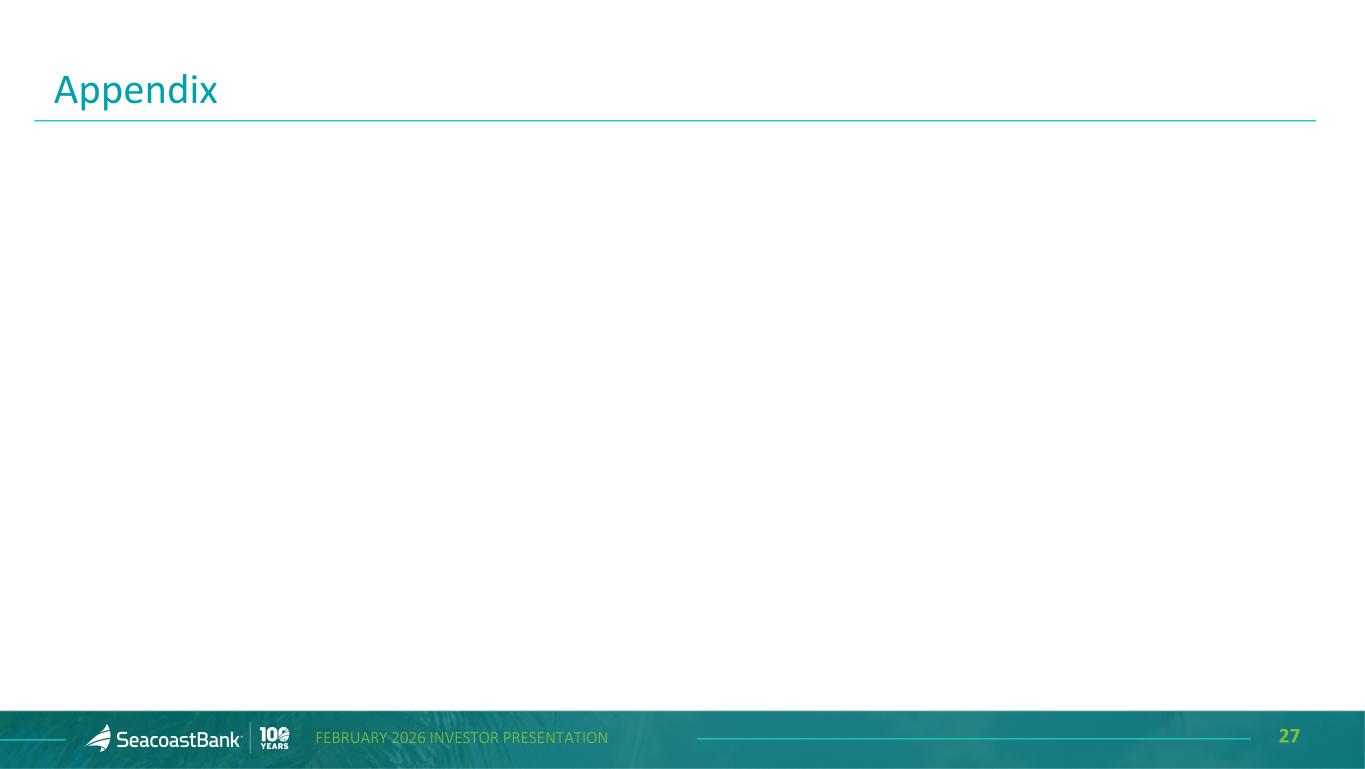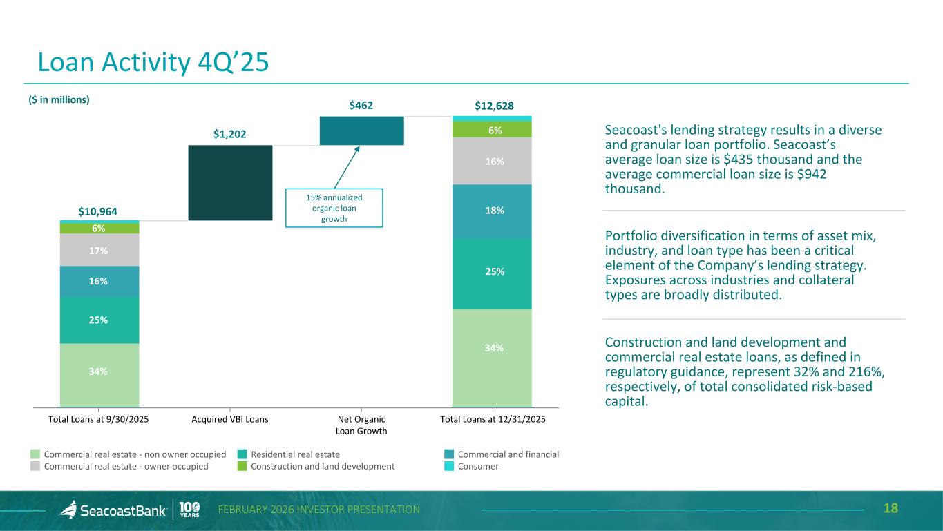 17FEBRUARY 2026 INVESTOR PRESENTATION $10,300 $10,443 $10,609 $10,964 $12,628 5.93% 5.90% 5.98% 5.96% 6.02% 5.48% 5.58% 5.58% 5.61% 5.68% Yield Excluding Accretion on Acquired Loans Reported Yield Total Loans 4Q'24 1Q'25 2Q'25 3Q'25 4Q'25 $634.1 $904.1 $861.2 $1,134.1 $947.9 4Q'24 1Q'25 2Q'25 3Q'25 4Q'25 Commercial Loan Pipeline ($ in millions) Total Loans End-of-Period ($ in millions) Consistent Strong Loan Growth Supported by a Strong Pipeline Loans outstanding increased by $1.7 billion from the prior quarter, including the addition of $1.2 billion from the VBI acquisition. Excluding the impact of the VBI acquisition, organic loan growth in the fourth quarter of 2025 was 15% on an annualized basis. $96 million of residential mortgage production in The Villages community footprint was retained in the portfolio. The late stage commercial pipeline totaled $948 million at December 31, 2025.
