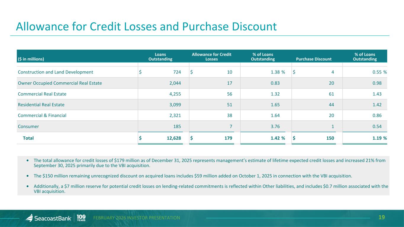 18FEBRUARY 2026 INVESTOR PRESENTATION Loan Activity 4Q’25 Commercial real estate - non owner occupied Residential real estate Commercial and financial Commercial real estate - owner occupied Construction and land development Consumer $10,964 $1,202 $462 Total Loans at 9/30/2025 Acquired VBI Loans Net Organic Loan Growth Total Loans at 12/31/2025 15% annualized organic loan growth $12,628 $10,964 34% 25% 16% 17% 6% 34% 25% 18% 16% 6% ($ in millions) Seacoast's lending strategy results in a diverse and granular loan portfolio. Seacoast’s average loan size is $435 thousand and the average commercial loan size is $942 thousand. Portfolio diversification in terms of asset mix, industry, and loan type has been a critical element of the Company’s lending strategy. Exposures across industries and collateral types are broadly distributed. Construction and land development and commercial real estate loans, as defined in regulatory guidance, represent 32% and 216%, respectively, of total consolidated risk-based capital.