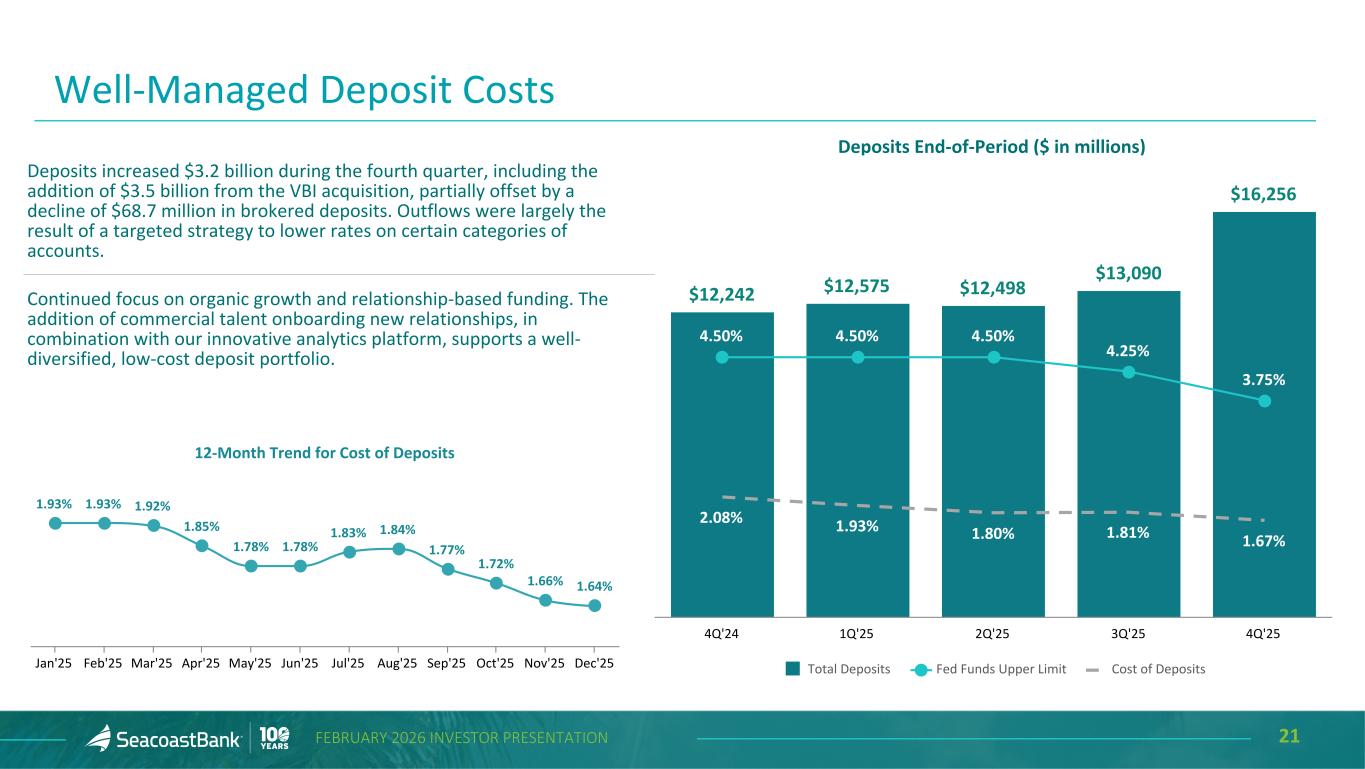 20FEBRUARY 2026 INVESTOR PRESENTATION Net Charge-Offs 0.24% 0.27% 0.09% 0.12% 0.03% NCO/Average Loans 4Q'24 1Q'25 2Q'25 3Q'25 4Q'25 Allowance for Credit Losses 1.34% 1.34% 1.34% 1.34% 1.42% ACL/Total Loans 4Q'24 1Q'25 2Q'25 3Q'25 4Q'25 Continued Strong Asset Quality Trends Nonperforming Loans 0.90% 0.68% 0.61% 0.55% 0.57% 0.15% 0.16% 0.13% 0.19% 0.26% NPL/Total Loans Accruing Past Due / Total Loans 4Q'24 1Q'25 2Q'25 3Q'25 4Q'25 Criticized and Classified Loans 2.17% 2.41% 2.39% 2.50% 2.82% Criticized and Classified Loans / Total Loans 4Q'24 1Q'25 2Q'25 3Q'25 4Q'25 1Ratios increased in the fourth quarter of 2025 as a result of the VBI acquisition. 1 1 1