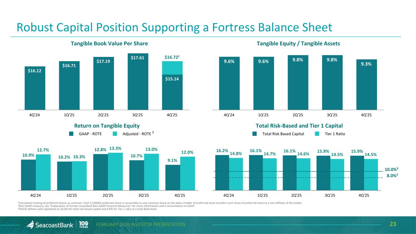 23FEBRUARY 2026 INVESTOR PRESENTATION $16.12 $16.71 $17.19 $17.61 $15.14 4Q'24 1Q'25 2Q'25 3Q'25 4Q'25 9.6% 9.6% 9.8% 9.8% 9.3% 4Q'24 1Q'25 2Q'25 3Q'25 4Q'25 16.2% 16.1% 16.1% 15.9% 15.9%14.8% 14.7% 14.6% 14.5% 14.5% Total Risk Based Capital Tier 1 Ratio 4Q'24 1Q'25 2Q'25 3Q'25 4Q'25 10.9% 10.2% 12.8% 10.7% 9.1% 12.7% 10.3% 13.3% 13.0% 12.0% GAAP - ROTE Adjusted - ROTE 4Q'24 1Q'25 2Q'25 3Q'25 4Q'25 1Calculated treating all preferred shares as common. Each 1/1000th preferred share is convertible to one common share on the date a holder of preferred stock transfers such share of preferred stock to a non-affiliate of the holder. 2Non-GAAP measure, see “Explanation of Certain Unaudited Non-GAAP Financial Measures" for more information and a reconciliation to GAAP. 3FDICIA defines well capitalized as 10.0% for total risk-based capital and 8.0% for Tier 1 ratio at a total Bank level. Tangible Book Value Per Share Tangible Equity / Tangible Assets Total Risk-Based and Tier 1 CapitalReturn on Tangible Equity 2 10.0%3 8.0%3 Robust Capital Position Supporting a Fortress Balance Sheet $16.721