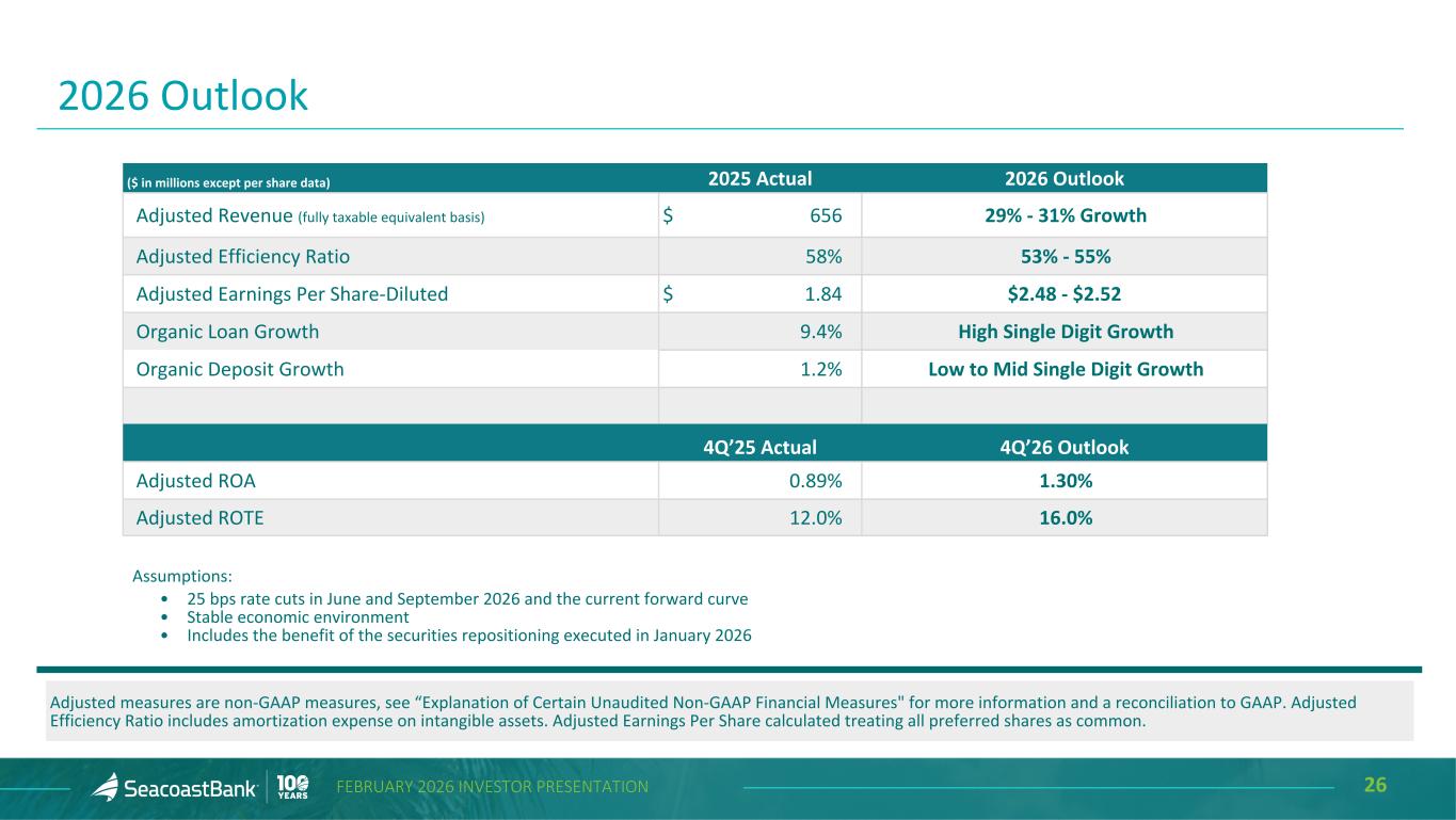 26FEBRUARY 2026 INVESTOR PRESENTATION 2026 Outlook ($ in millions except per share data) 2025 Actual 2026 Outlook Adjusted Revenue (fully taxable equivalent basis) $ 656 29% - 31% Growth Adjusted Efficiency Ratio 58 % 53% - 55% Adjusted Earnings Per Share-Diluted $ 1.84 $2.48 - $2.52 Organic Loan Growth 9.4 % High Single Digit Growth Organic Deposit Growth 1.2 % Low to Mid Single Digit Growth 4Q’25 Actual 4Q’26 Outlook Adjusted ROA 0.89 % 1.30% Adjusted ROTE 12.0 % 16.0% Adjusted measures are non-GAAP measures, see “Explanation of Certain Unaudited Non-GAAP Financial Measures" for more information and a reconciliation to GAAP. Adjusted Efficiency Ratio includes amortization expense on intangible assets. Adjusted Earnings Per Share calculated treating all preferred shares as common. Assumptions: • 25 bps rate cuts in June and September 2026 and the current forward curve • Stable economic environment • Includes the benefit of the securities repositioning executed in January 2026
