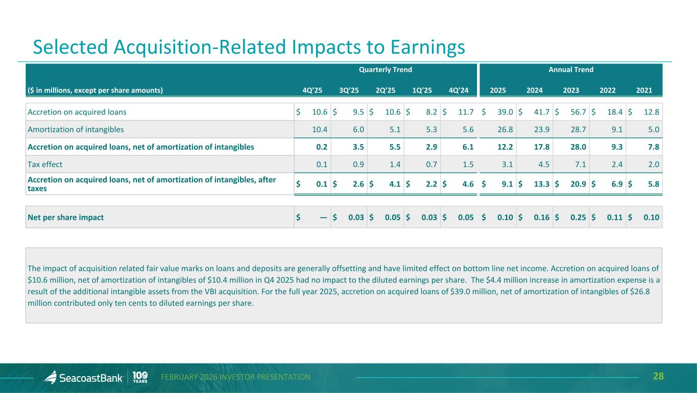 28FEBRUARY 2026 INVESTOR PRESENTATION Selected Acquisition-Related Impacts to Earnings Quarterly Trend Annual Trend ($ in millions, except per share amounts) 4Q’25 3Q’25 2Q’25 1Q’25 4Q’24 2025 2024 2023 2022 2021 Accretion on acquired loans $ 10.6 $ 9.5 $ 10.6 $ 8.2 $ 11.7 $ 39.0 $ 41.7 $ 56.7 $ 18.4 $ 12.8 Amortization of intangibles 10.4 6.0 5.1 5.3 5.6 26.8 23.9 28.7 9.1 5.0 Accretion on acquired loans, net of amortization of intangibles 0.2 3.5 5.5 2.9 6.1 12.2 17.8 28.0 9.3 7.8 Tax effect 0.1 0.9 1.4 0.7 1.5 3.1 4.5 7.1 2.4 2.0 Accretion on acquired loans, net of amortization of intangibles, after taxes $ 0.1 $ 2.6 $ 4.1 $ 2.2 $ 4.6 $ 9.1 $ 13.3 $ 20.9 $ 6.9 $ 5.8 Net per share impact $ — $ 0.03 $ 0.05 $ 0.03 $ 0.05 $ 0.10 $ 0.16 $ 0.25 $ 0.11 $ 0.10 The impact of acquisition related fair value marks on loans and deposits are generally offsetting and have limited effect on bottom line net income. Accretion on acquired loans of $10.6 million, net of amortization of intangibles of $10.4 million in Q4 2025 had no impact to the diluted earnings per share. The $4.4 million increase in amortization expense is a result of the additional intangible assets from the VBI acquisition. For the full year 2025, accretion on acquired loans of $39.0 million, net of amortization of intangibles of $26.8 million contributed only ten cents to diluted earnings per share.