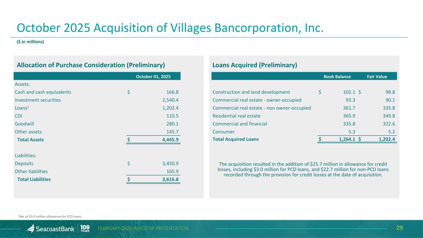 29FEBRUARY 2026 INVESTOR PRESENTATION Allocation of Purchase Consideration (Preliminary) October 2025 Acquisition of Villages Bancorporation, Inc. October 01, 2025 Assets: Cash and cash equivalents $ 166.8 Investment securities 2,540.4 Loans1 1,202.4 CDI 110.5 Goodwill 280.1 Other assets 145.7 Total Assets $ 4,445.9 Liabilities: Deposits $ 3,450.9 Other liabilities 165.9 Total Liabilities $ 3,616.8 Loans Acquired (Preliminary) Book Balance Fair Value Construction and land development $ 102.1 $ 98.8 Commercial real estate - owner-occupied 93.3 90.1 Commercial real estate - non owner-occupied 361.7 335.8 Residential real estate 365.9 349.8 Commercial and financial 335.8 322.6 Consumer 5.3 5.2 Total Acquired Loans $ 1,264.1 $ 1,202.4 The acquisition resulted in the addition of $25.7 million in allowance for credit losses, including $3.0 million for PCD loans, and $22.7 million for non-PCD loans recorded through the provision for credit losses at the date of acquisition. ($ in millions) 1Net of $3.0 million allowance for PCD loans.