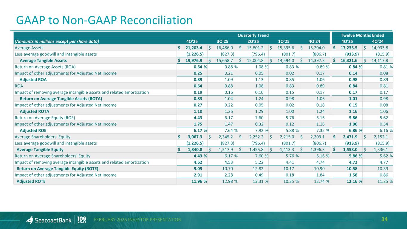 33FEBRUARY 2026 INVESTOR PRESENTATION GAAP to Non-GAAP Reconciliation Quarterly Trend Twelve Months Ended (Amounts in millions except per share data) 4Q'25 3Q'25 2Q'25 1Q'25 4Q'24 4Q'25 4Q'24 Adjusted Noninterest Expense $ 112.4 $ 91.2 $ 89.3 $ 89.5 $ 85.3 $ 382.4 $ 335.9 Provision for credit losses on unfunded commitments (0.8) (0.2) (0.2) (0.2) (0.3) (1.3) (1.0) Other real estate owned expense and net gain (loss) on sale — 0.3 — (0.2) (0.1) 0.1 (0.4) Amortization of intangibles (10.4) (6.0) (5.1) (5.3) (5.6) (26.8) (23.9) Net Adjusted Noninterest Expense 101.2 85.4 84.0 83.8 79.4 354.5 310.6 Average tangible assets $ 19,976.9 $ 15,658.7 $ 15,004.8 $ 14,594.0 $ 14,397.3 $ 16,321.6 $ 14,117.8 Net Adjusted Noninterest Expense to Average Tangible Assets 2.01 % 2.16 % 2.25 % 2.33 % 2.19 % 2.17 % 2.20 % Net Revenue $ 203.3 $ 157.3 $ 151.4 $ 140.7 $ 132.9 $ 652.6 $ 515.4 Total Adjustments to Net Revenue (0.1) 0.8 — (0.2) 8.4 0.5 8.0 Impact of FTE adjustment 1.6 0.4 0.4 0.3 0.3 2.8 1.1 Adjusted Net Revenue on a FTE basis $ 204.8 $ 158.6 $ 151.8 $ 140.8 $ 141.6 $ 656.0 $ 524.5 Adjusted Efficiency Ratio 54.50 % 57.63 % 58.74 % 63.30 % 60.01 % 58.13 % 63.77 % Net Interest Income $ 174.6 $ 133.5 $ 126.9 $ 118.5 $ 115.8 $ 553.5 $ 432.0 Impact of FTE adjustment 1.6 0.4 0.4 0.3 0.3 2.8 1.1 Net Interest Income Including FTE adjustment 176.2 133.9 127.3 118.9 116.1 556.3 433.0 Total noninterest income 28.6 23.8 24.5 22.2 17.1 99.2 83.4 Total noninterest expense less provision for credit losses on unfunded commitments 129.7 101.8 91.6 90.4 85.3 413.6 342.3 Pre-Tax Pre-Provision Earnings 75.1 55.9 60.2 50.6 47.9 241.9 174.2 Total Adjustments to Noninterest Income (0.1) 0.8 — (0.2) 8.4 0.5 8.0 Total Adjustments to Noninterest Expense including other real estate owned expense and net gain (loss) on sale 18.1 10.5 2.4 1.3 0.4 32.3 7.8 Adjusted Pre-Tax Pre-Provision Earnings $ 93.2 $ 67.2 $ 62.6 $ 51.7 $ 56.6 $ 274.7 $ 190.0
