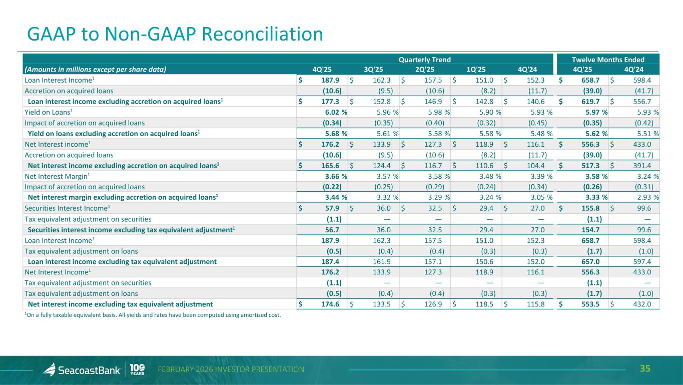 34FEBRUARY 2026 INVESTOR PRESENTATION Quarterly Trend Twelve Months Ended (Amounts in millions except per share data) 4Q'25 3Q'25 2Q'25 1Q'25 4Q'24 4Q'25 4Q'24 Average Assets $ 21,203.4 $ 16,486.0 $ 15,801.2 $ 15,395.6 $ 15,204.0 $ 17,235.5 $ 14,933.8 Less average goodwill and intangible assets (1,226.5) (827.3) (796.4) (801.7) (806.7) (913.9) (815.9) Average Tangible Assets $ 19,976.9 $ 15,658.7 $ 15,004.8 $ 14,594.0 $ 14,397.3 $ 16,321.6 $ 14,117.8 Return on Average Assets (ROA) 0.64 % 0.88 % 1.08 % 0.83 % 0.89 % 0.84 % 0.81 % Impact of other adjustments for Adjusted Net Income 0.25 0.21 0.05 0.02 0.17 0.14 0.08 Adjusted ROA 0.89 1.09 1.13 0.85 1.06 0.98 0.89 ROA 0.64 0.88 1.08 0.83 0.89 0.84 0.81 Impact of removing average intangible assets and related amortization 0.19 0.16 0.16 0.15 0.17 0.17 0.17 Return on Average Tangible Assets (ROTA) 0.83 1.04 1.24 0.98 1.06 1.01 0.98 Impact of other adjustments for Adjusted Net Income 0.27 0.22 0.05 0.02 0.18 0.15 0.08 Adjusted ROTA 1.10 1.26 1.29 1.00 1.24 1.16 1.06 Return on Average Equity (ROE) 4.43 6.17 7.60 5.76 6.16 5.86 5.62 Impact of other adjustments for Adjusted Net Income 1.75 1.47 0.32 0.12 1.16 1.00 0.54 Adjusted ROE 6.17 % 7.64 % 7.92 % 5.88 % 7.32 % 6.86 % 6.16 % Average Shareholders' Equity $ 3,067.3 $ 2,345.2 $ 2,252.2 $ 2,215.0 $ 2,203.1 $ 2,471.9 $ 2,152.1 Less average goodwill and intangible assets (1,226.5) (827.3) (796.4) (801.7) (806.7) (913.9) (815.9) Average Tangible Equity $ 1,840.8 $ 1,517.9 $ 1,455.8 $ 1,413.3 $ 1,396.3 $ 1,558.0 $ 1,336.1 Return on Average Shareholders' Equity 4.43 % 6.17 % 7.60 % 5.76 % 6.16 % 5.86 % 5.62 % Impact of removing average intangible assets and related amortization 4.62 4.53 5.22 4.41 4.74 4.72 4.77 Return on Average Tangible Equity (ROTE) 9.05 10.70 12.82 10.17 10.90 10.58 10.39 Impact of other adjustments for Adjusted Net Income 2.91 2.28 0.49 0.18 1.84 1.58 0.86 Adjusted ROTE 11.96 % 12.98 % 13.31 % 10.35 % 12.74 % 12.16 % 11.25 % GAAP to Non-GAAP Reconciliation