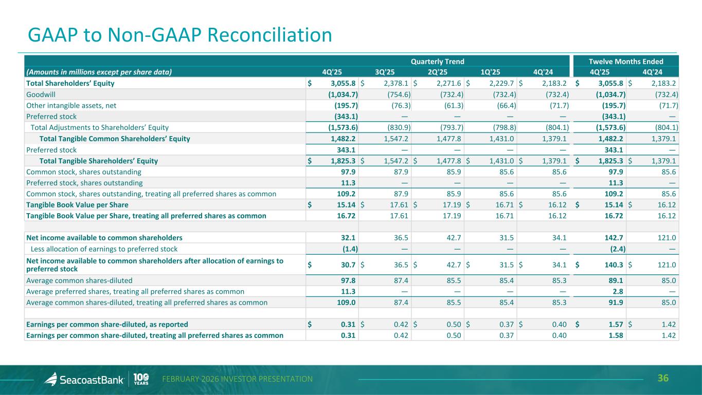 35FEBRUARY 2026 INVESTOR PRESENTATION Quarterly Trend Twelve Months Ended (Amounts in millions except per share data) 4Q'25 3Q'25 2Q'25 1Q'25 4Q'24 4Q'25 4Q'24 Loan Interest Income1 $ 187.9 $ 162.3 $ 157.5 $ 151.0 $ 152.3 $ 658.7 $ 598.4 Accretion on acquired loans (10.6) (9.5) (10.6) (8.2) (11.7) (39.0) (41.7) Loan interest income excluding accretion on acquired loans1 $ 177.3 $ 152.8 $ 146.9 $ 142.8 $ 140.6 $ 619.7 $ 556.7 Yield on Loans1 6.02 % 5.96 % 5.98 % 5.90 % 5.93 % 5.97 % 5.93 % Impact of accretion on acquired loans (0.34) (0.35) (0.40) (0.32) (0.45) (0.35) (0.42) Yield on loans excluding accretion on acquired loans1 5.68 % 5.61 % 5.58 % 5.58 % 5.48 % 5.62 % 5.51 % Net Interest income1 $ 176.2 $ 133.9 $ 127.3 $ 118.9 $ 116.1 $ 556.3 $ 433.0 Accretion on acquired loans (10.6) (9.5) (10.6) (8.2) (11.7) (39.0) (41.7) Net interest income excluding accretion on acquired loans1 $ 165.6 $ 124.4 $ 116.7 $ 110.6 $ 104.4 $ 517.3 $ 391.4 Net Interest Margin1 3.66 % 3.57 % 3.58 % 3.48 % 3.39 % 3.58 % 3.24 % Impact of accretion on acquired loans (0.22) (0.25) (0.29) (0.24) (0.34) (0.26) (0.31) Net interest margin excluding accretion on acquired loans1 3.44 % 3.32 % 3.29 % 3.24 % 3.05 % 3.33 % 2.93 % Securities Interest Income1 $ 57.9 $ 36.0 $ 32.5 $ 29.4 $ 27.0 $ 155.8 $ 99.6 Tax equivalent adjustment on securities (1.1) — — — — (1.1) — Securities interest income excluding tax equivalent adjustment1 56.7 36.0 32.5 29.4 27.0 154.7 99.6 Loan Interest Income1 187.9 162.3 157.5 151.0 152.3 658.7 598.4 Tax equivalent adjustment on loans (0.5) (0.4) (0.4) (0.3) (0.3) (1.7) (1.0) Loan interest income excluding tax equivalent adjustment 187.4 161.9 157.1 150.6 152.0 657.0 597.4 Net Interest Income1 176.2 133.9 127.3 118.9 116.1 556.3 433.0 Tax equivalent adjustment on securities (1.1) — — — — (1.1) — Tax equivalent adjustment on loans (0.5) (0.4) (0.4) (0.3) (0.3) (1.7) (1.0) Net interest income excluding tax equivalent adjustment $ 174.6 $ 133.5 $ 126.9 $ 118.5 $ 115.8 $ 553.5 $ 432.0 1On a fully taxable equivalent basis. All yields and rates have been computed using amortized cost. GAAP to Non-GAAP Reconciliation