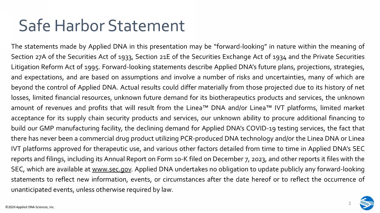 The statements made by Applied DNA in this presentation may be “forward - looking” in nature within the meaning of Section 27 A of the Securities Act of 1933 , Section 21 E of the Securities Exchange Act of 1934 and the Private Securities Litigation Reform Act of 1995 . Forward - looking statements describe Applied DNA’s future plans, projections, strategies, and expectations, and are based on assumptions and involve a number of risks and uncertainties, many of which are beyond the control of Applied DNA . Actual results could differ materially from those projected due to its history of net losses, limited financial resources, unknown future demand for its biotherapeutics products and services, the unknown amount of revenues and profits that will result from the Linea DNA and/or Linea IVT platforms, limited market acceptance for its supply chain security products and services, our unknown ability to procure additional financing to build our GMP manufacturing facility, the declining demand for Applied DNA’s COVID - 19 testing services, the fact that there has never been a commercial drug product utilizing PCR - produced DNA technology and/or the Linea DNA or Linea IVT platforms approved for therapeutic use, and various other factors detailed from time to time in Applied DNA’s SEC reports and filings, including its Annual Report on Form 10 - K filed on December 7 , 2023 , and other reports it files with the SEC, which are available at www . sec . gov . Applied DNA undertakes no obligation to update publicly any forward - looking statements to reflect new information, events, or circumstances after the date hereof or to reflect the occurrence of unanticipated events, unless otherwise required by law . 2 ©2024 Applied DNA Sciences, Inc. Safe Harbor Statement