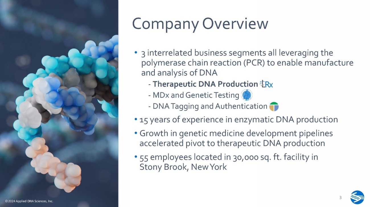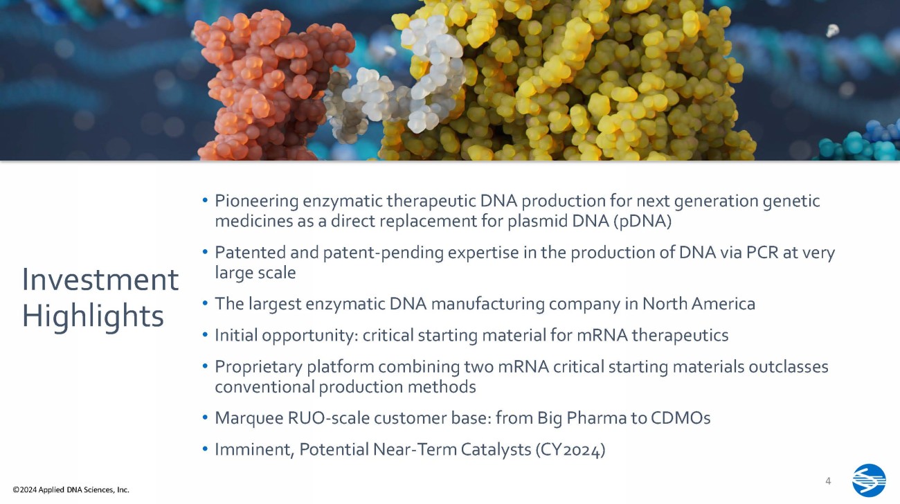 Company Overview • 3 interrelated business segments all leveraging the polymerase chain reaction (PCR) to enable manufacture and analysis of DNA - Therapeutic DNA Production - MDx and Genetic Testing - DNA Tagging and Authentication • 15 years of experience in enzymatic DNA production • Growth in genetic medicine development pipelines accelerated pivot to therapeutic DNA production • 55 employees located in 30,000 sq. ft. facility in Stony Brook, New York ©2024 Applied DNA Sciences, Inc. 3 ©2024 Applied DNA Sciences, Inc.