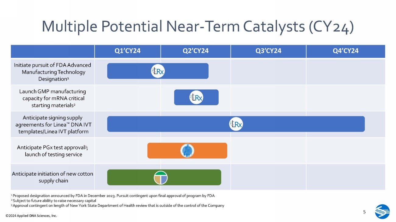 I n v es t m e nt Highlights • Pioneering enzymatic therapeutic DNA production for next generation genetic medicines as a direct replacement for plasmid DNA (pDNA) • Patented and patent - pending expertise in the production of DNA via PCR at very large scale • The largest enzymatic DNA manufacturing company in North America • Initial opportunity: critical starting material for mRNA therapeutics • Proprietary platform combining two mRNA critical starting materials outclasses conventional production methods • Marquee RUO - scale customer base: from Big Pharma to CDMOs • Imminent, Potential Near - Term Catalysts (CY2024) 4 ©2024 Applied DNA Sciences, Inc.