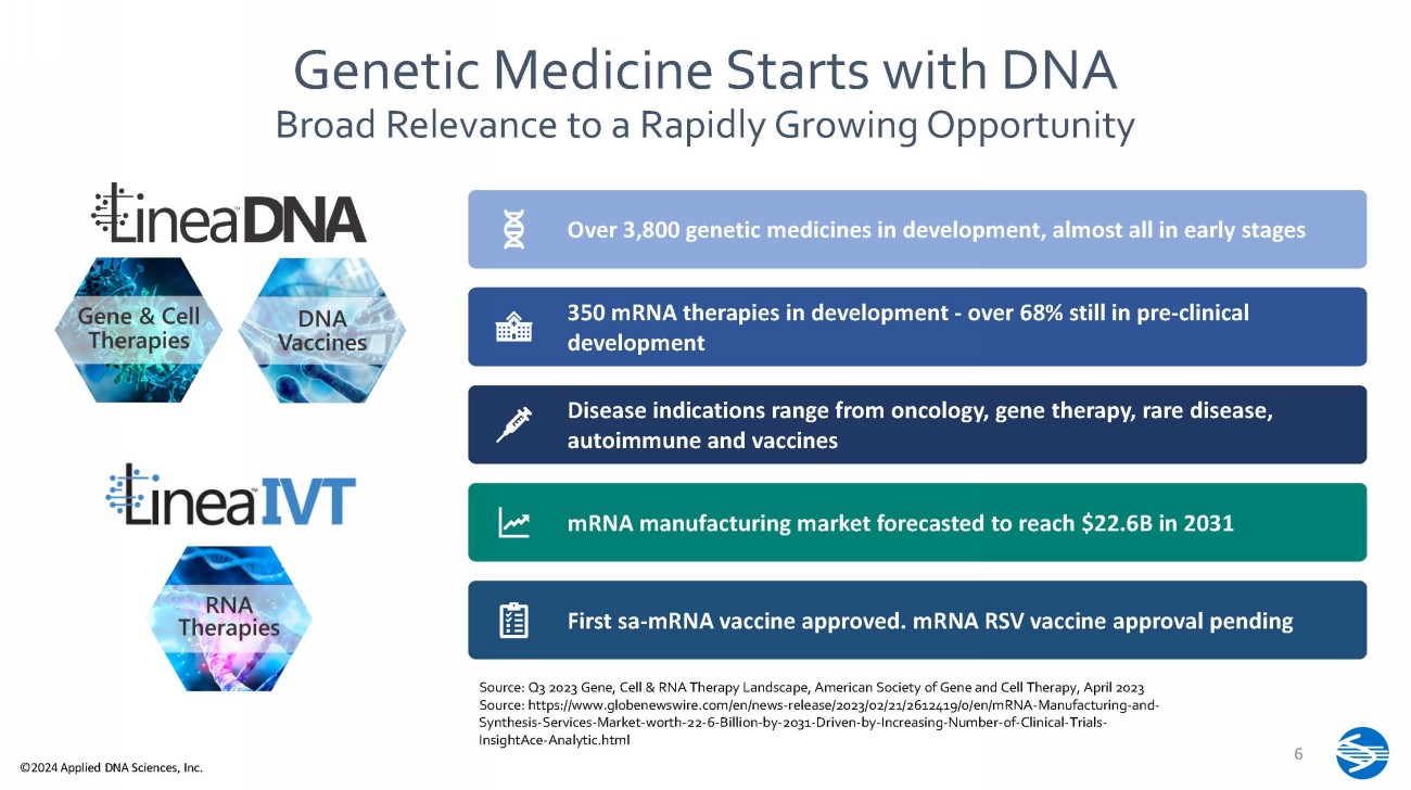 Q1’CY24 Q2’CY24 Q3’CY24 Q4’CY24 Initiate pursuit of FDA Advanced Manufacturing Technology Designation 1 Launch GMP manufacturing capacity for mRNA critical starting materials 2 Anticipate signing supply agreements for Linea DNA IVT templates/Linea IVT platform Anticipate PGx test approval 3 ; launch of testing service Anticipate initiation of new cotton supply chain 1 Proposed designation announced by FDA in December 2023. Pursuit contingent upon final approval of program by FDA 2 Subject to future ability to raise necessary capital 3 Approval contingent on length of New York State Department of Health review that is outside of the control of the Company Multiple Potential Near - Term Catalysts (CY24) 5 ©2024 Applied DNA Sciences, Inc.