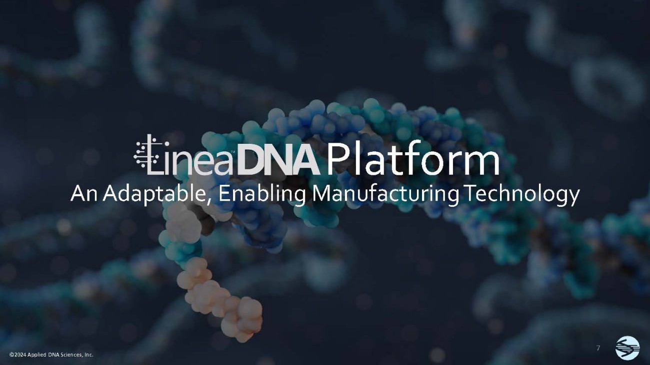 Genetic Medicine Starts with DNA Broad Relevance to a Rapidly Growing Opportunity Over 3,800 genetic medicines in development, almost all in early stages 350 mRNA therapies in development - over 68% still in pre - clinical development Disease indications range from oncology, gene therapy, rare disease, autoimmune and vaccines mRNA manufacturing market forecasted to reach $22.6B in 2031 First sa - mRNA vaccine approved. mRNA RSV vaccine approval pending Source: Q3 2023 Gene, Cell & RNA Therapy Landscape, American Society of Gene and Cell Therapy, April 2023 Source: https:// www.globenewswire.com/en/news - release/2023/02/21/2612419/0/en/mRNA - Manufacturing - and - Synthesis - Services - Market - worth - 22 - 6 - Billion - by - 2031 - Driven - by - Increasing - Number - of - Clinical - Trials - InsightAce - Analytic.html 6 ©2024 Applied DNA Sciences, Inc.