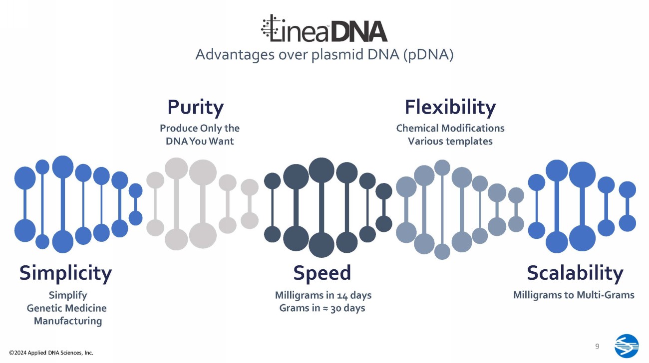 STEP 01 Obtain DNA Target Sequence and Design PCR Primers STEP 05 Provide Linea DNA to Customer STEP 04 Step 2 Perform High - Fidelity Large - Scale PCR STEP 03 Purify PCR Amplicons Pl a t fo r m Perform Analytical Characterization of PCR Amplicons Only 4 input ingredients 5 production steps Can be completed in under 2 weeks Uses enzymes and is 100% cell free Large yield in small footprint Uses scalable benchtop instruments Simple process is well suited to cGMP Platform DNA Made Simple 8 ©2024 Applied DNA Sciences, Inc.