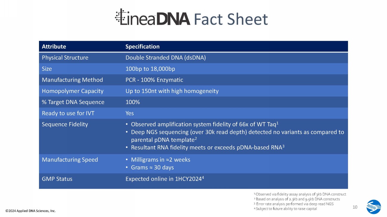 Advantages over plasmid DNA (pDNA) Simplicity Simplify Genetic Medicine Manufacturing Purity Produce Only the DNA You Want Speed Milligrams in 14 days Grams in ≈ 30 days Flexibility Chemical Modifications Various templates Scalability Milligrams to Multi - Grams 9 ©2024 Applied DNA Sciences, Inc.
