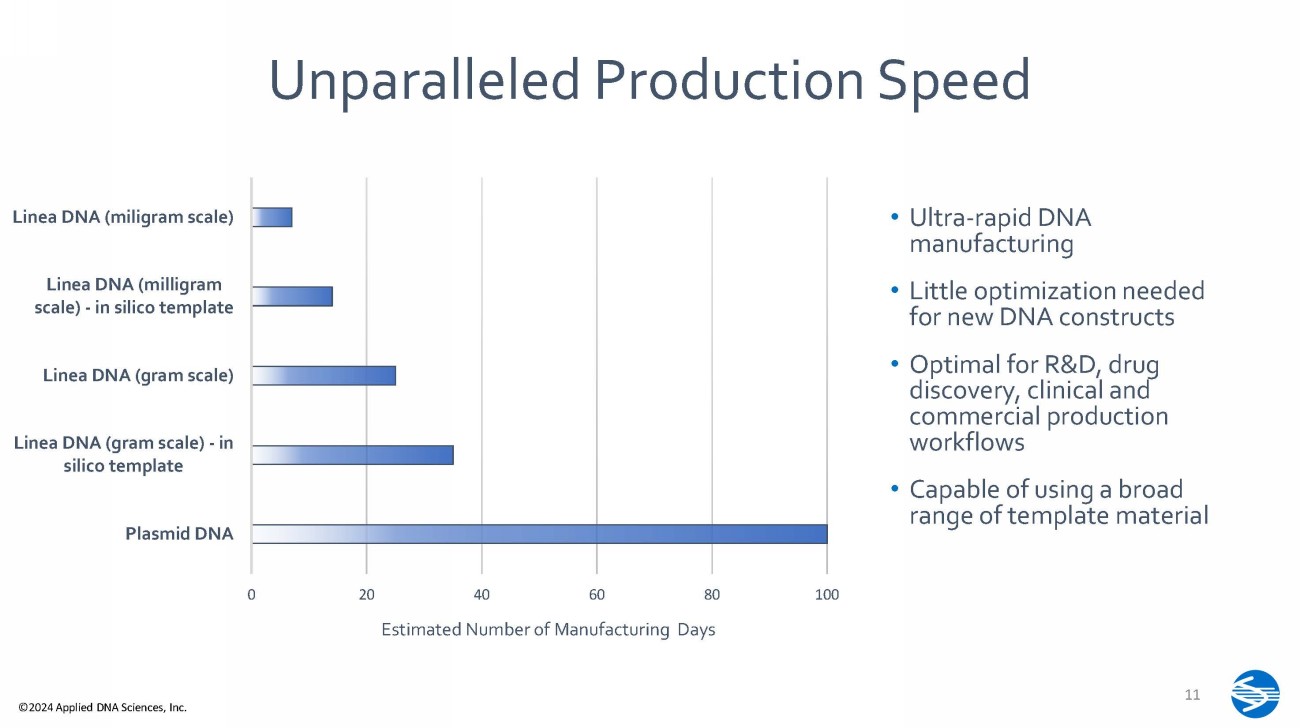 1 Observed via fidelity assay analysis of 3kb DNA construct 2 Based on analysis of 2.3kb and 9.5kb DNA constructs 3 Error rate analysis performed via deep read NGS Attribute Specification Physical Structure Double Stranded DNA (dsDNA) Size 100bp to 18,000bp Manufacturing Method PCR - 100% Enzymatic Homopolymer Capacity Up to 150nt with high homogeneity % Target DNA Sequence 100% Ready to use for IVT Yes Sequence Fidelity • Observed amplification system fidelity of 66x of WT Taq 1 • Deep NGS sequencing (over 30k read depth) detected no variants as compared to parental pDNA template 2 • Resultant RNA fidelity meets or exceeds pDNA - based RNA 3 Manufacturing Speed • Milligrams in ≈2 weeks • Grams ≈ 30 days GMP Status Expected online in 1HCY2024 4 Fact Sheet 10 4 Subject to future ability to raise capital ©2024 Applied DNA Sciences, Inc.