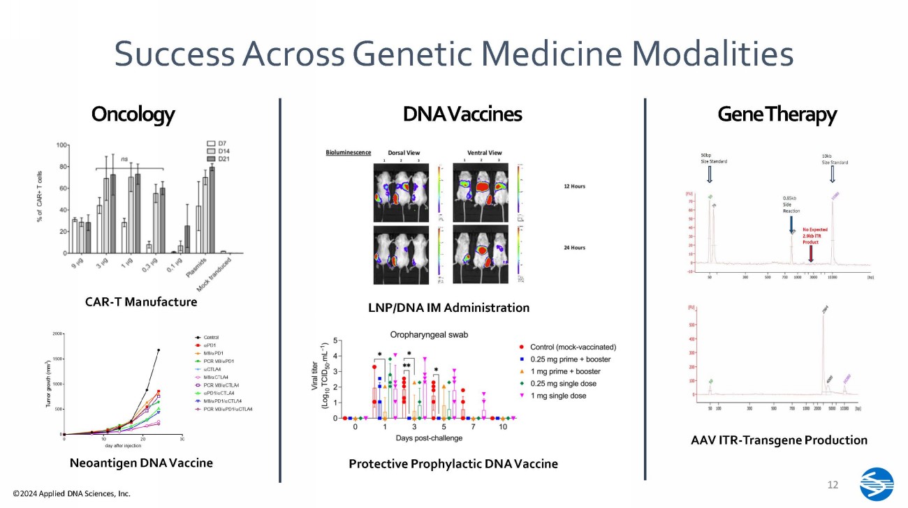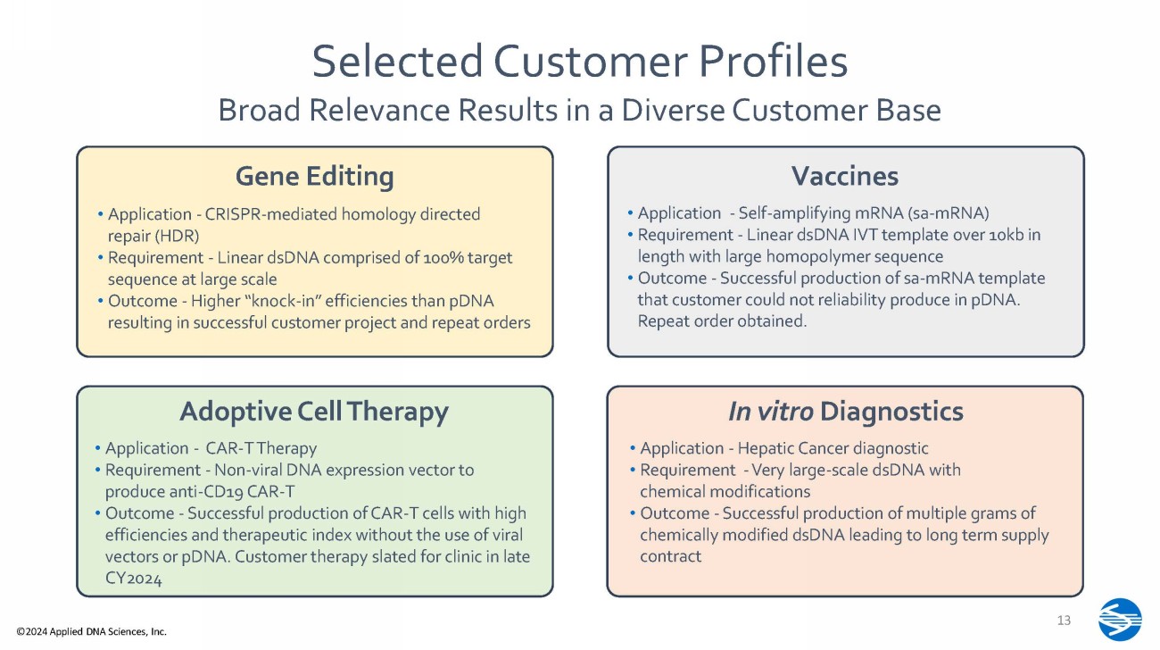 Success Across Genetic Medicine Modalities Oncology DNAVaccines GeneTherapy 12 ©2024 Applied DNA Sciences, Inc. CAR - T Manufacture Neoantigen DNA Vaccine LNP/DNA IM Administration Protective Prophylactic DNA Vaccine AAV ITR - Transgene Production