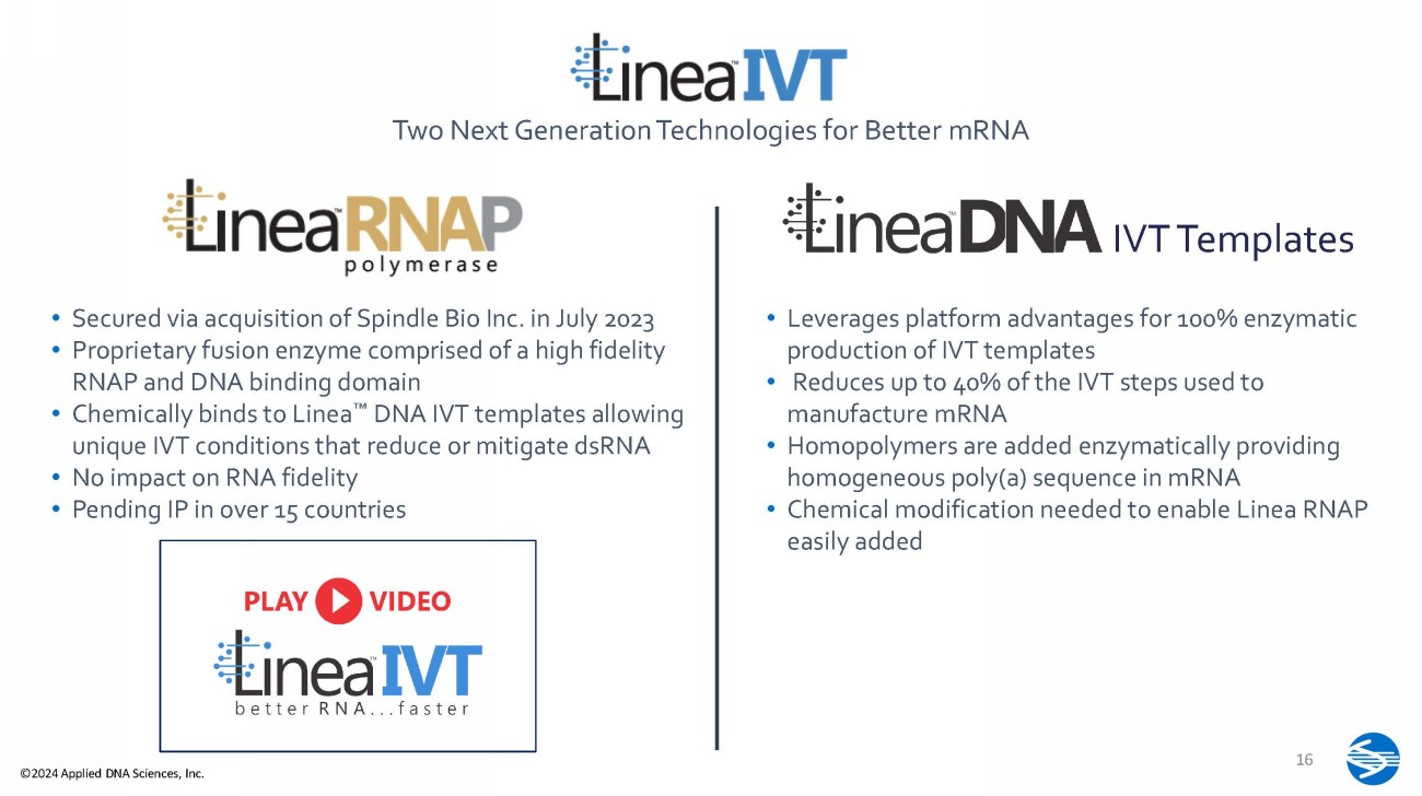 Conventional mRNA Manufacturing Problems Long lead times increase mRNA production timeline 15 ©2024 Applied DNA Sciences, Inc. Struggles with complex DNA sequences such as Poly(A) tails Requires expensive enzymatic linearization and additional filtration steps Problematic inflammatory byproduct of conventional IVT dsRNA removal is essential for safe and effective mRNA products Increased regulatory scrutiny Currently mitigated via expensive and complex purification methods Defined by WHO as a hazardous byproduct that must be removed Increased regulatory scrutiny and QC issue Bacterially derived pDNA is currently the starting material for mRNA