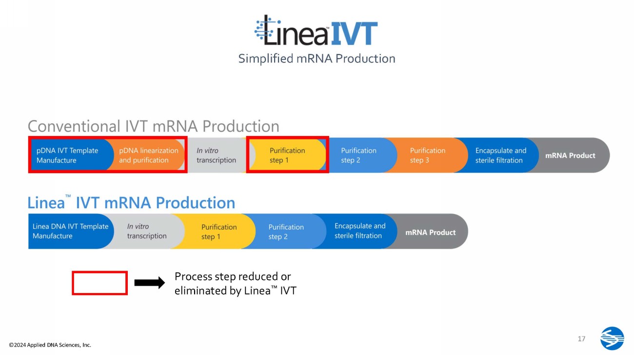 Two Next Generation Technologies for Better mRNA • Secured via acquisition of Spindle Bio Inc. in July 2023 • Proprietary fusion enzyme comprised of a high fidelity RNAP and DNA binding domain • Chemically binds to Linea DNA IVT templates allowing unique IVT conditions that reduce or mitigate dsRNA • No impact on RNA fidelity • Pending IP in over 15 countries IVT Templates • Leverages platform advantages for 100% enzymatic production of IVT templates • Reduces up to 40% of the IVT steps used to manufacture mRNA • Homopolymers are added enzymatically providing homogeneous poly(a) sequence in mRNA • Chemical modification needed to enable Linea RNAP easily added 16 ©2024 Applied DNA Sciences, Inc.