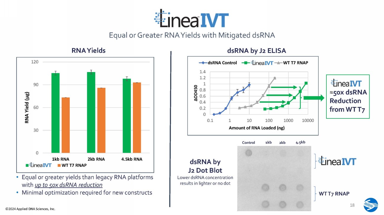 Process step reduced or eli m i n a t ed b y L i n ea I V T Simplified mRNA Production 17 ©2024 Applied DNA Sciences, Inc.