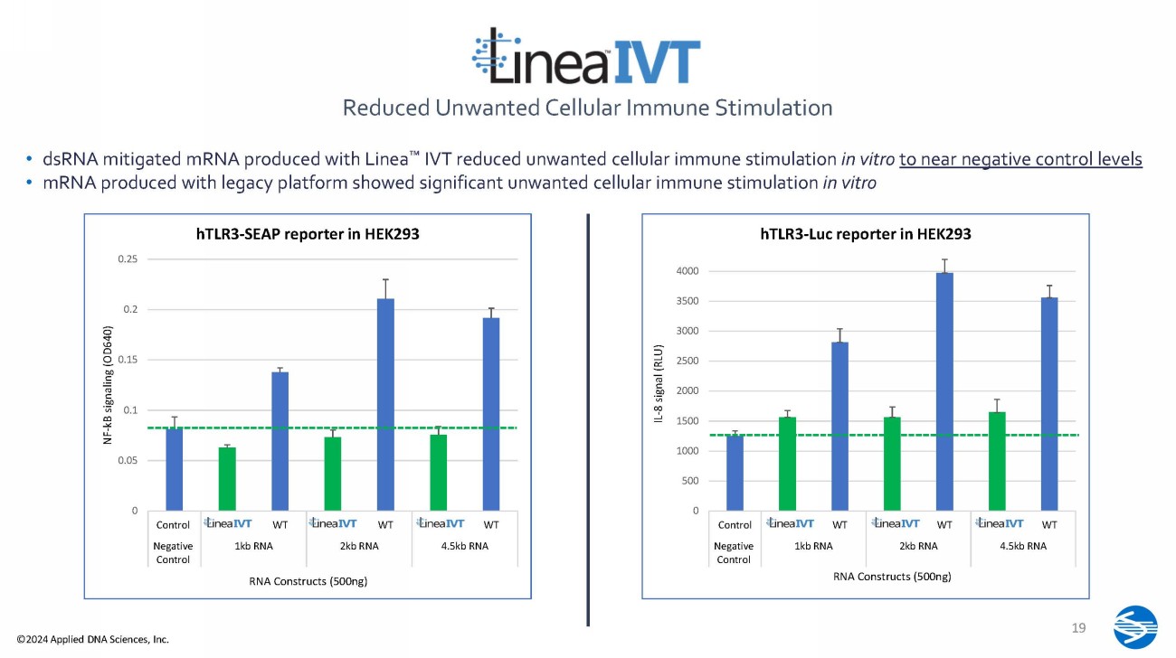 0 30 60 90 1 20 2kb RNA 4.5kb RNA RNA Yield (µg) Linea IVT…. 1kb RNA WT T7 RNAP 1 kb 2 kb 4 . 5kb C o n t r ol 1 .4 1 .2 1 0 .8 0 .6 0 .4 0 .2 0 0 .1 ΔOD450 1 10 1 0 0 1 0 00 1 0 0 00 Amount of RNA Loaded (ng) Linea IVT dsRNA by J2 ELISA dsRNA Control WT T7 RNAP WT T7 RNAP ≈ 50x dsRNA Reduction from WT T7 dsRNA by J2 Dot Blot Lower dsRNA concentration results in lighter or no dot RNA Yields • Equal or greater yields than legacy RNA platforms with up to 50x dsRNA reduction • Minimal optimization required for new constructs Equal or Greater RNAYields with Mitigated dsRNA 18 ©2024 Applied DNA Sciences, Inc.