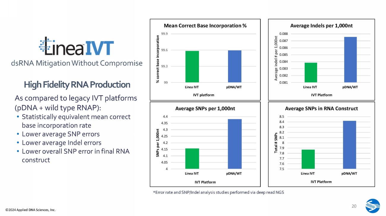 0 0.05 0.1 0.15 0.2 0.25 Control Linea IVT WT Linea IVT WT Linea IVT WT N e g a ti ve Control 1kb RNA 2kb RNA 4.5kb RNA NF - kB signaling (OD640) RNA Constructs (500ng) 4000 3500 3000 2500 2000 1500 1000 500 0 Control Linea IVT WT Linea IVT WT Linea IVT WT N e g a ti ve Control 1kb RNA 2kb RNA 4.5kb RNA IL - 8 signal (RLU) RNA Constructs (500ng) • dsRNA mitigated mRNA produced with Linea IVT reduced unwanted cellular immune stimulation in vitro to near negative control levels • mRNA produced with legacy platform showed significant unwanted cellular immune stimulation in vitro hTLR3 - SEAP reporter in HEK293 hTLR3 - Luc reporter in HEK293 Reduced Unwanted Cellular Immune Stimulation 19 ©2024 Applied DNA Sciences, Inc.