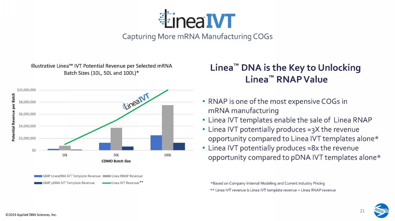 8.5 8.4 8.3 8.2 8.1 8 7.9 7.8 7.7 7.6 7.5 Linea IVT pDNA/WT Total # SNPs IVT Platform Average SNPs in RNA Construct 0.088 0.087 0.086 0.085 0.084 0.083 0.082 0.081 Linea IVT pDNA/WT Average Indel # per 1,000nt IVT Platform Average Indels per 1,000nt 4.4 4.35 4.3 4.25 4.2 4.15 4.1 4.05 4 Linea IVT pDNA/WT SNPs per 1,000nt IVT Platform Average SNPs per 1,000nt 99 99.3 99.6 99.9 Linea IVT pDNA/WT % correct base incorporation IVT platform Mean Correct Base Incorporation % High Fidelity RNA Production As compared to legacy IVT platforms (pDNA + wild type RNAP): • Statistically equivalent mean correct base incorporation rate • Lower average SNP errors • Lower average Indel errors • Lower overall SNP error in final RNA construct *Error rate and SNP/Indel analysis studies performed via deep read NGS dsRNA Mitigation Without Compromise 20 ©2024 Applied DNA Sciences, Inc.