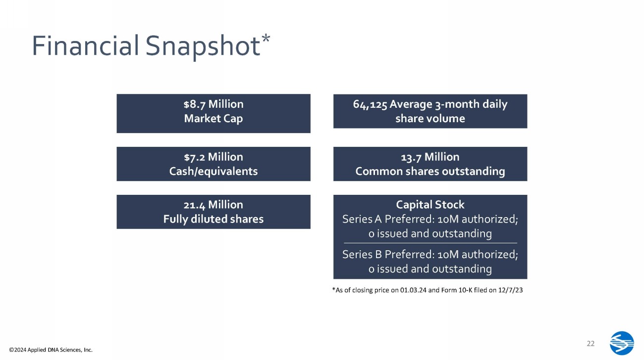 Financial Snapshot * $8.7 Million Market Cap 64,125 Average 3 - month daily share volume $7.2 Million C a s h /e q u i v a le n ts 13.7 Million Common shares outstanding 21.4 Million Fully diluted shares Capital Stock Series A Preferred: 10M authorized; 0 issued and outstanding Series B Preferred: 10M authorized; 0 issued and outstanding *As of closing price on 01.03.24 and Form 10 - K filed on 12/7/23 22 ©2024 Applied DNA Sciences, Inc.