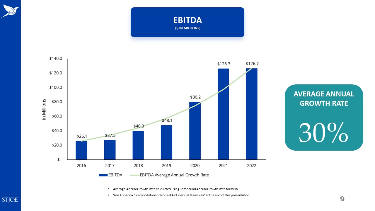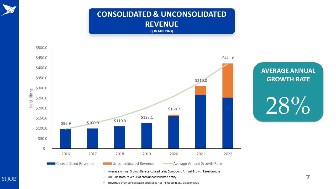CONSOLIDATED & UNCONSOLIDATED REVENUE  ($ IN MILLIONS)  7  AVERAGE ANNUAL GROWTH RATE  28%  Average Annual Growth Rate calculated using Compound Annual Growth Rate formula  Includes total revenue of each unconsolidated entity  Revenue of unconsolidated entities is not included in St. Joe’s revenue