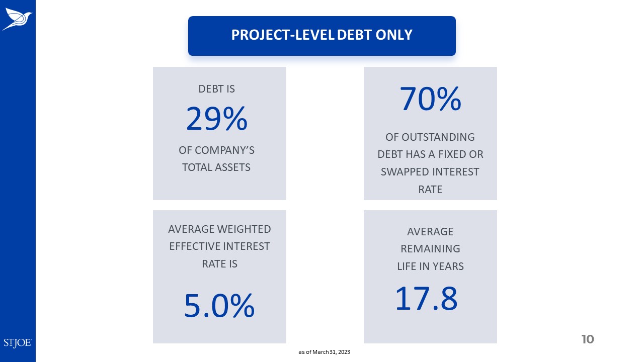 PROJECT-LEVEL DEBT ONLY  10  as of March 31, 2023  DEBT IS  29%  OF OUTSTANDING DEBT HAS A FIXED OR SWAPPED INTEREST RATE  70%  AVERAGE WEIGHTED EFFECTIVE INTEREST RATE IS  5.0%  AVERAGE   REMAINING   LIFE IN YEARS  17.8  OF COMPANY’S   TOTAL ASSETS