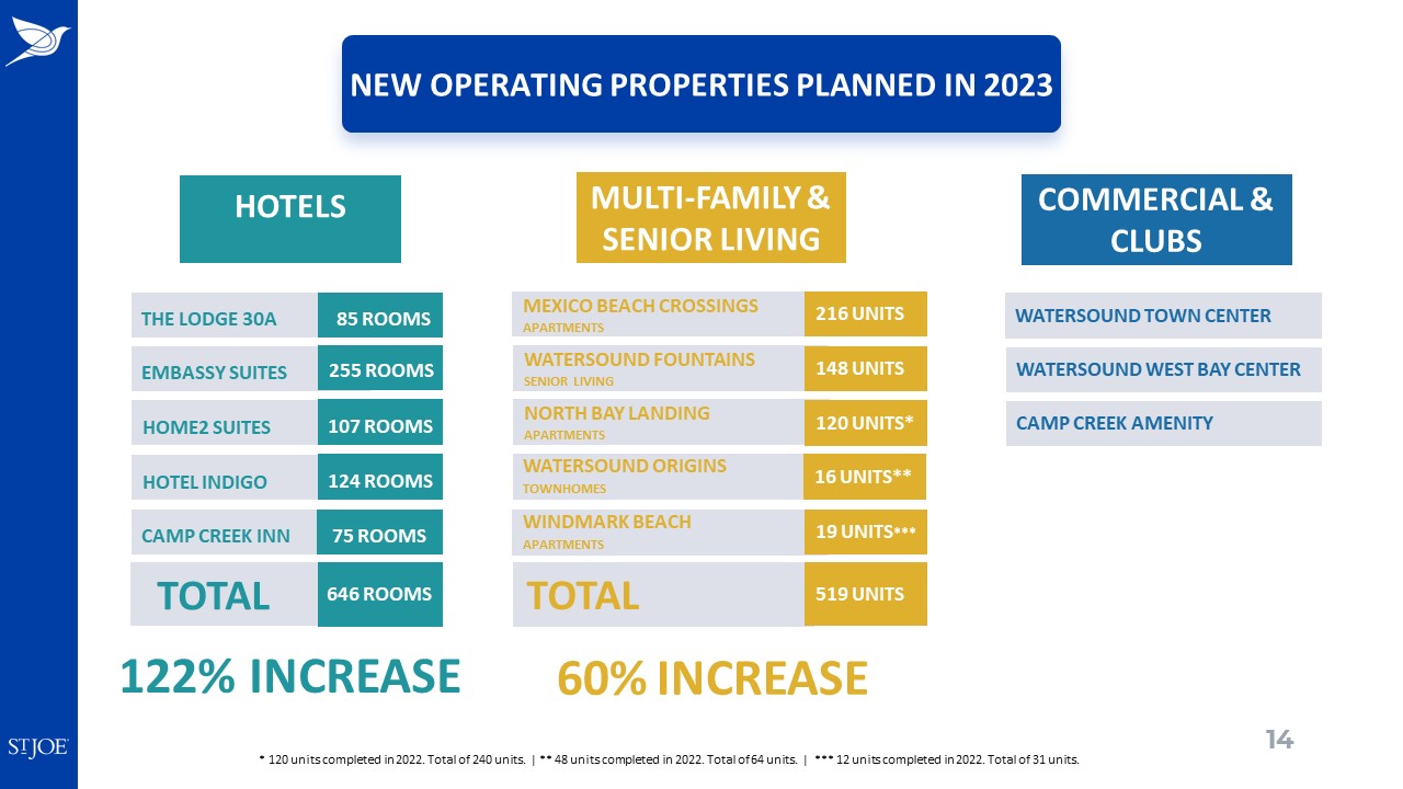 NEW OPERATING PROPERTIES PLANNED IN 2023  14  * 120 units completed in 2022. Total of 240 units. | ** 48 units completed in 2022. Total of 64 units. | *** 12 units completed in 2022. Total of 31 units.  HOTELS  MULTI-FAMILY &  SENIOR LIVING  COMMERCIAL & CLUBS  THE LODGE 30A  85 ROOMS  EMBASSY SUITES  HOME2 SUITES  HOTEL INDIGO  CAMP CREEK INN  107 ROOMS  124 ROOMS   75 ROOMS  255 ROOMS  TOTAL  646 ROOMS  122% INCREASE  MEXICO BEACH CROSSINGS  APARTMENTS  WATERSOUND FOUNTAINS  SENIOR LIVING  NORTH BAY LANDING  APARTMENTS  WATERSOUND ORIGINS  TOWNHOMES  WINDMARK BEACH  APARTMENTS  TOTAL  216 UNITS  148 UNITS  120 UNITS*  16 UNITS**  19 UNITS***  519 UNITS  60% INCREASE  WATERSOUND TOWN CENTER  WATERSOUND WEST BAY CENTER  CAMP CREEK AMENITY