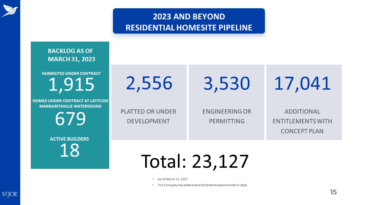 2023 AND BEYOND  RESIDENTIAL HOMESITE PIPELINE  15  Total: 23,127  BACKLOG AS OF MARCH 31, 2023  1,915  ACTIVE BUILDERS  PLATTED OR UNDER DEVELOPMENT  2,556  ADDITIONAL ENTITLEMENTS WITH CONCEPT PLAN  17,041  ENGINEERING OR PERMITTING  3,530  679  HOMES UNDER CONTRACT AT LATITUDE   MARGARITAVILLE WATERSOUND  18  As of March 31, 2023  The Company has additional entitlements beyond what is listed  HOMESITES UNDER CONTRACT