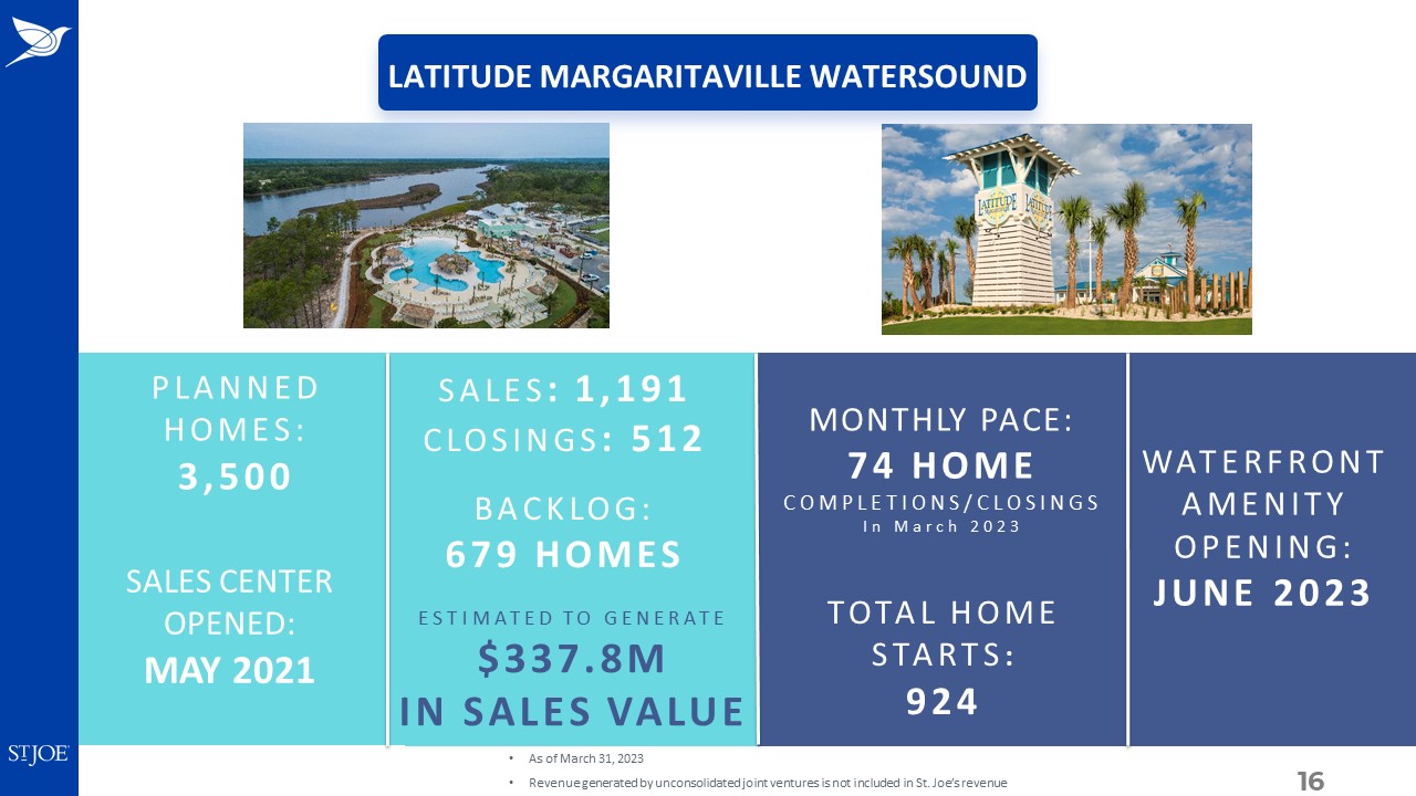 SALES CENTER OPENED:  MAY 2021  PLANNED HOMES:  3,500  As of March 31, 2023  Revenue generated by unconsolidated joint ventures is not included in St. Joe’s revenue  LATITUDE MARGARITAVILLE WATERSOUND   BACKLOG:  679 HOMES  ESTIMATED TO GENERATE  $337.8M  IN SALES VALUE  WATERFRONT AMENITY  OPENING:  JUNE 2023  TOTAL HOME STARTS:   924  SALES: 1,191   CLOSINGS: 512   MONTHLY PACE:   74 HOME COMPLETIONS/CLOSINGS  In March 2023  16