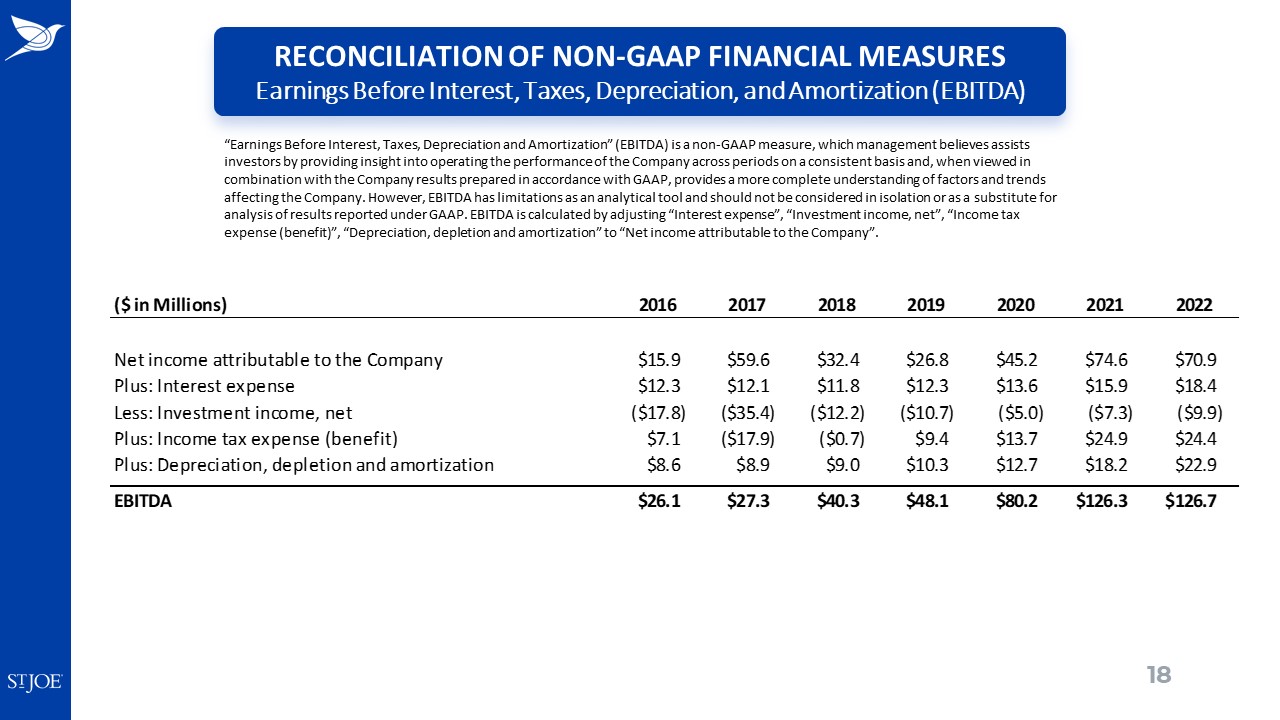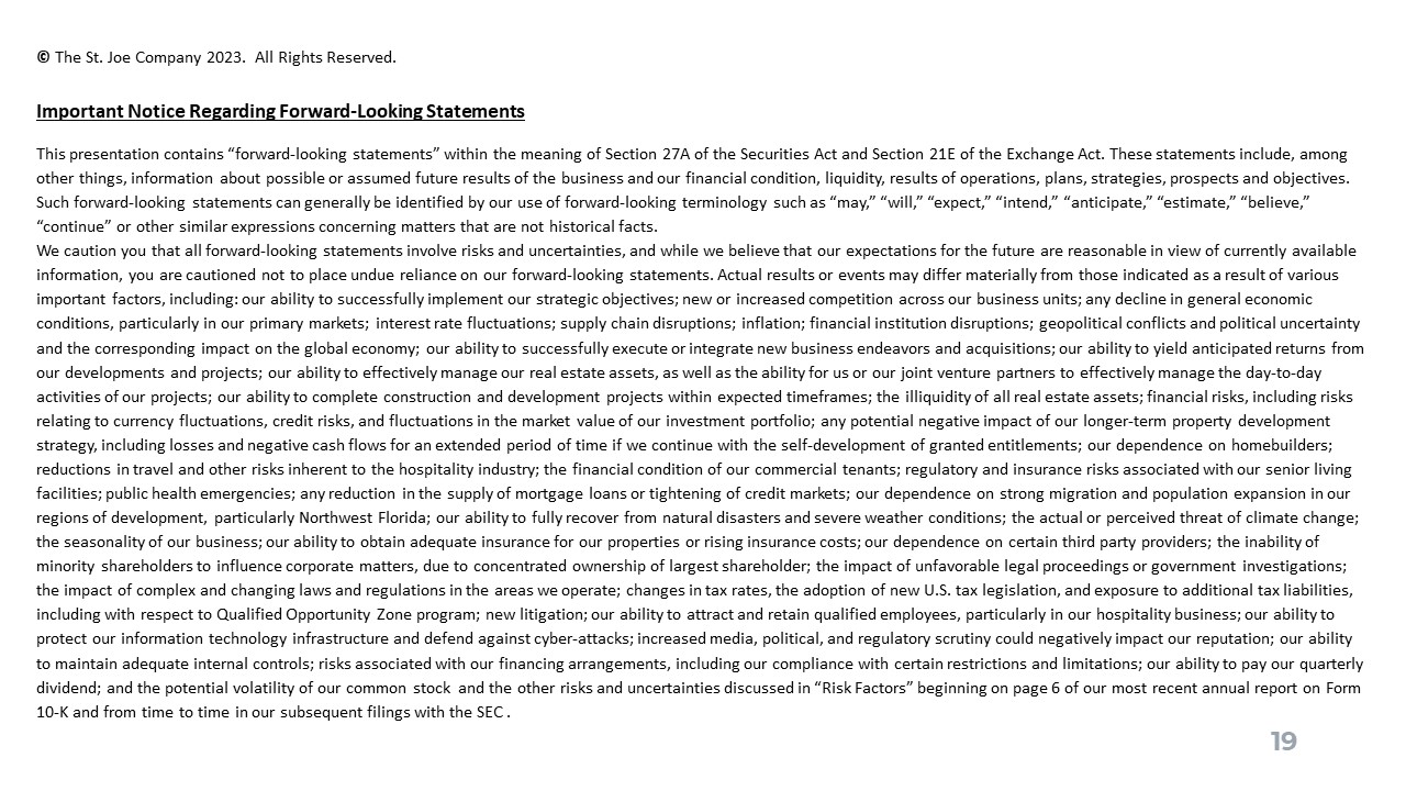 19  © The St. Joe Company 2023. All Rights Reserved.   Important Notice Regarding Forward-Looking Statements     This presentation contains “forward-looking statements” within the meaning of Section 27A of the Securities Act and Section 21E of the Exchange Act. These statements include, among other things, information about possible or assumed future results of the business and our financial condition, liquidity, results of operations, plans, strategies, prospects and objectives. Such forward-looking statements can generally be identified by our use of forward-looking terminology such as “may,” “will,” “expect,” “intend,” “anticipate,” “estimate,” “believe,” “continue” or other similar expressions concerning matters that are not historical facts.  We caution you that all forward-looking statements involve risks and uncertainties, and while we believe that our expectations for the future are reasonable in view of currently available information, you are cautioned not to place undue reliance on our forward-looking statements. Actual results or events may differ materially from those indicated as a result of various important factors, including: our ability to successfully implement our strategic objectives; new or increased competition across our business units; any decline in general economic conditions, particularly in our primary markets; interest rate fluctuations; supply chain disruptions; inflation; financial institution disruptions; geopolitical conflicts and political uncertainty and the corresponding impact on the global economy; our ability to successfully execute or integrate new business endeavors and acquisitions; our ability to yield anticipated returns from our developments and projects; our ability to effectively manage our real estate assets, as well as the ability for us or our joint venture partners to effectively manage the day-to-day activities of our projects; our ability to complete construction and development projects within expected timeframes; the illiquidity of all real estate assets; financial risks, including risks relating to currency fluctuations, credit risks, and fluctuations in the market value of our investment portfolio; any potential negative impact of our longer-term property development strategy, including losses and negative cash flows for an extended period of time if we continue with the self-development of granted entitlements; our dependence on homebuilders; reductions in travel and other risks inherent to the hospitality industry; the financial condition of our commercial tenants; regulatory and insurance risks associated with our senior living facilities; public health emergencies; any reduction in the supply of mortgage loans or tightening of credit markets; our dependence on strong migration and population expansion in our regions of development, particularly Northwest Florida; our ability to fully recover from natural disasters and severe weather conditions; the actual or perceived threat of climate change; the seasonality of our business; our ability to obtain adequate insurance for our properties or rising insurance costs; our dependence on certain third party providers; the inability of minority shareholders to influence corporate matters, due to concentrated ownership of largest shareholder; the impact of unfavorable legal proceedings or government investigations; the impact of complex and changing laws and regulations in the areas we operate; changes in tax rates, the adoption of new U.S. tax legislation, and exposure to additional tax liabilities, including with respect to Qualified Opportunity Zone program; new litigation; our ability to attract and retain qualified employees, particularly in our hospitality business; our ability to protect our information technology infrastructure and defend against cyber-attacks; increased media, political, and regulatory scrutiny could negatively impact our reputation; our ability to maintain adequate internal controls; risks associated with our financing arrangements, including our compliance with certain restrictions and limitations; our ability to pay our quarterly dividend; and the potential volatility of our common stock and the other risks and uncertainties discussed in “Risk Factors” beginning on page 6 of our most recent annual report on Form 10-K and from time to time in our subsequent filings with the SEC .