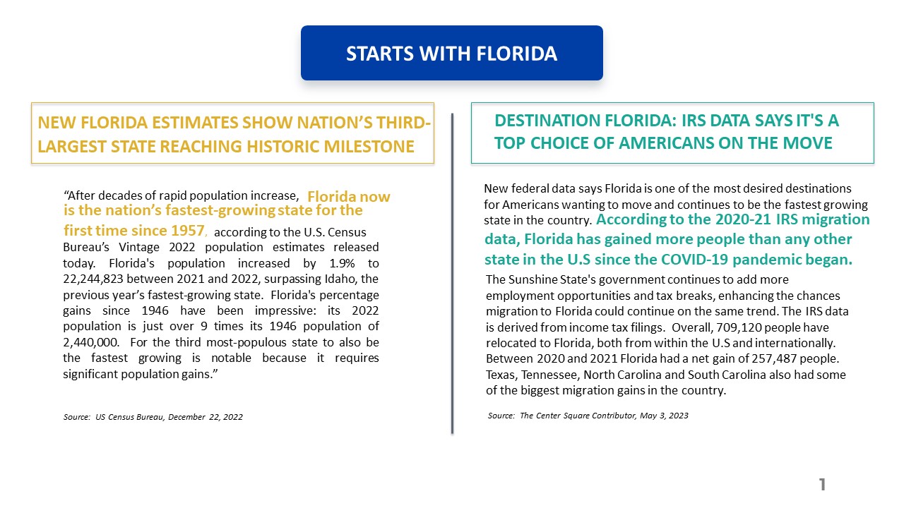 STARTS WITH FLORIDA  New Florida Estimates Show Nation’s Third-Largest State Reaching Historic Milestone  “After decades of rapid population increase,   Source: US Census Bureau, December 22, 2022  New federal data says Florida is one of the most desired destinations for Americans wanting to move and continues to be the fastest growing state in the country.   Destination Florida: IRS Data Says it's a Top Choice of Americans on the Move  1  Florida now  is the nation’s fastest-growing state for the first time since 1957,   Bureau’s Vintage 2022 population estimates released today. Florida's population increased by 1.9% to 22,244,823 between 2021 and 2022, surpassing Idaho, the previous year’s fastest-growing state.  Florida's percentage gains since 1946 have been impressive: its 2022 population is just over 9 times its 1946 population of 2,440,000.  For the third most-populous state to also be the fastest growing is notable because it requires significant population gains.”  according to the U.S. Census  data, Florida has gained more people than any other state in the U.S since the COVID-19 pandemic began.    The Sunshine State's government continues to add more employment opportunities and tax breaks, enhancing the chances migration to Florida could continue on the same trend. The IRS data is derived from income tax filings.  Overall, 709,120 people have relocated to Florida, both from within the U.S and internationally. Between 2020 and 2021 Florida had a net gain of 257,487 people. Texas, Tennessee, North Carolina and South Carolina also had some of the biggest migration gains in the country.   Source:  The Center Square Contributor, May 3, 2023  According to the 2020-21 IRS migration