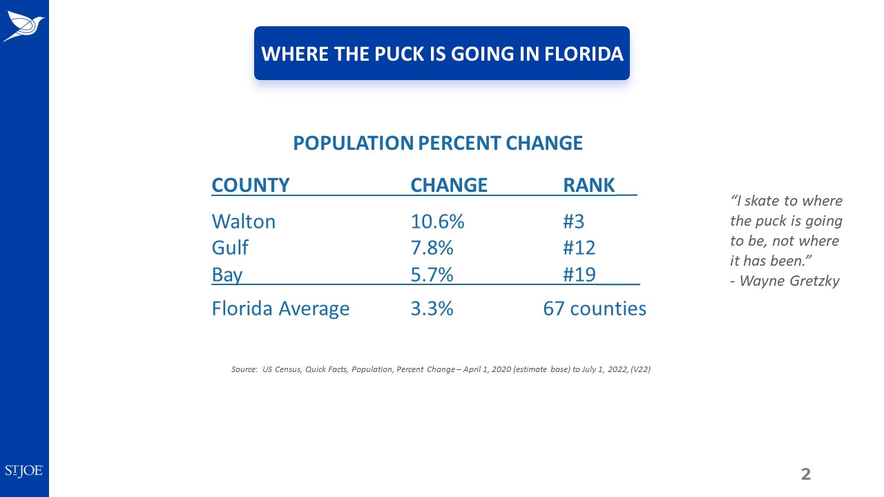 WHERE THE PUCK IS GOING IN FLORIDA  Source:  US Census, Quick Facts, Population, Percent Change – April 1, 2020 (estimate base) to July 1, 2022, (V22)  2  “I skate to where the puck is going to be, not where it has been.”  - Wayne Gretzky  POPULATION PERCENT CHANGE  COUNTY CHANGE RANK__  Walton 10.6% #3  Gulf 7.8% #12  Bay 5.7% #19____  Florida Average 3.3% 67 counties
