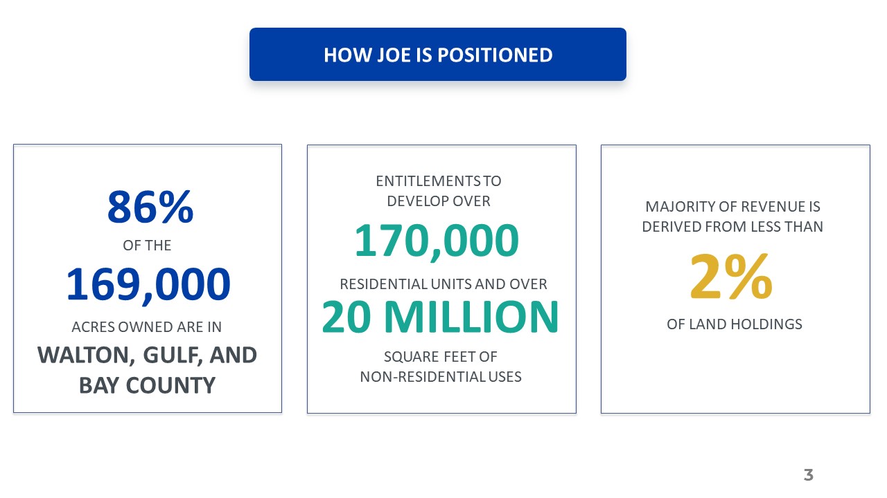 HOW JOE IS POSITIONED  86%  OF THE  169,000  ACRES OWNED ARE IN   WALTON, GULF, AND   BAY COUNTY  ENTITLEMENTS TO DEVELOP OVER  170,000  RESIDENTIAL UNITS AND OVER  20 MILLION  SQUARE FEET OF   NON-RESIDENTIAL USES  MAJORITY OF REVENUE IS DERIVED FROM LESS THAN  2%  OF LAND HOLDINGS  3