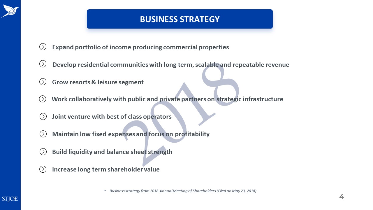2018  4  Expand portfolio of income producing commercial properties  Develop residential communities with long term, scalable and repeatable revenue  Grow resorts & leisure segment  Work collaboratively with public and private partners on strategic infrastructure  Joint venture with best of class operators  Maintain low fixed expenses and focus on profitability  Build liquidity and balance sheet strength  Increase long term shareholder value  BUSINESS STRATEGY  Business strategy from 2018 Annual Meeting of Shareholders (Filed on May 23, 2018)