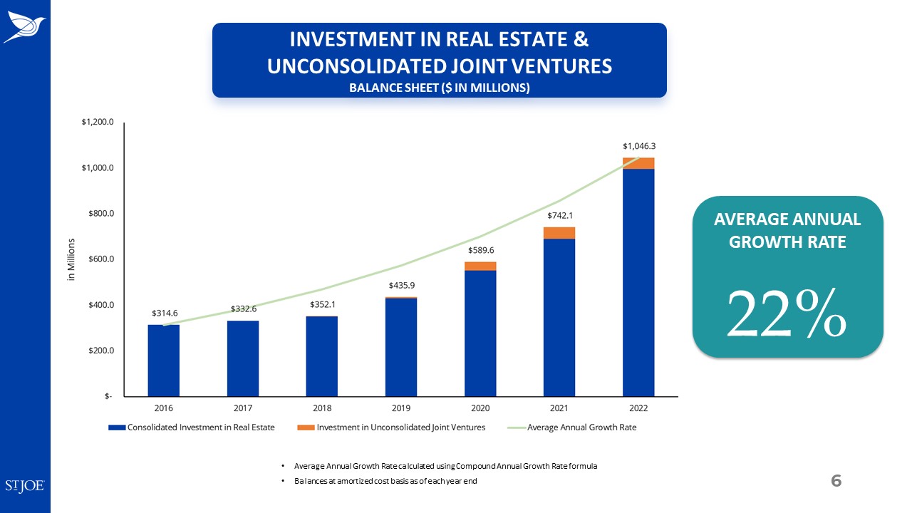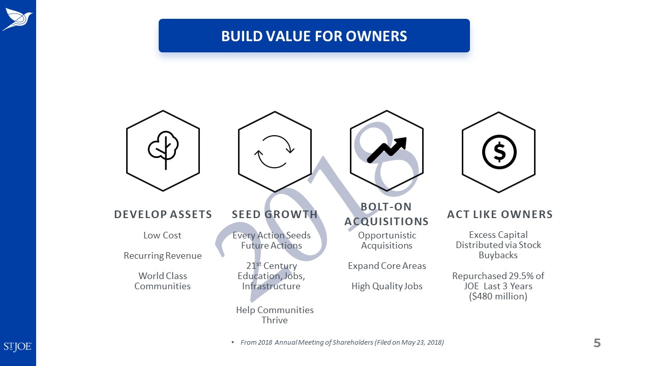 2018  5  DEVELOP ASSETS  Low Cost   Recurring Revenue  World Class Communities  SEED GROWTH  Every Action Seeds Future Actions  21st Century Education, Jobs, Infrastructure  Help Communities Thrive  BOLT-ON  ACQUISITIONS  Opportunistic Acquisitions  Expand Core Areas  High Quality Jobs  ACT LIKE OWNERS  Excess Capital Distributed via Stock Buybacks  Repurchased 29.5% of JOE Last 3 Years  ($480 million)  BUILD VALUE FOR OWNERS  From 2018 Annual Meeting of Shareholders (Filed on May 23, 2018)