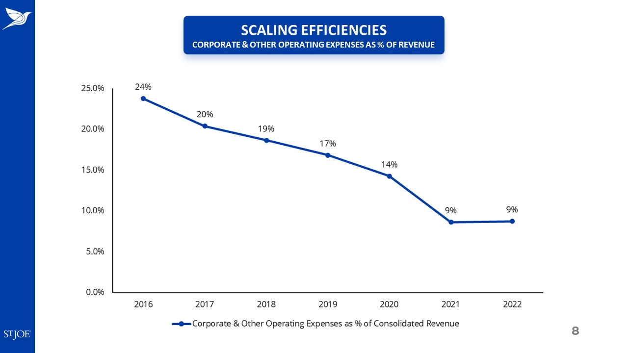 SCALING EFFICIENCIES  CORPORATE & OTHER OPERATING EXPENSES AS % OF REVENUE  8