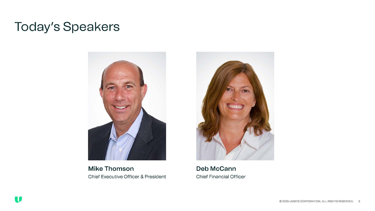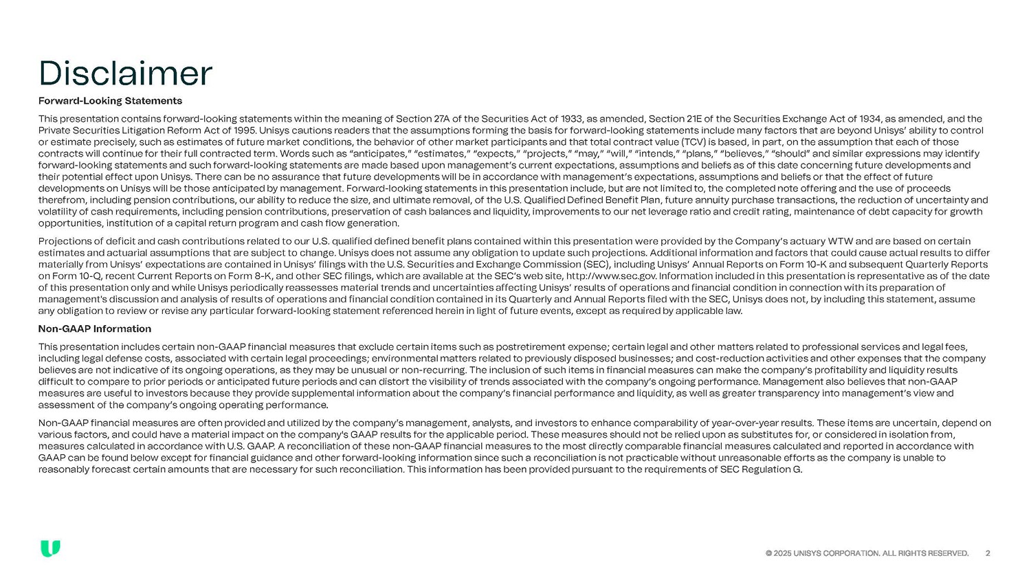 Disclaimer Forward - Looking Statements This presentation contains forward - looking statements within the meaning of Section 27A of the Securities Act of 1933, as amende d, Section 21E of the Securities Exchange Act of 1934, as amended, and the Private Securities Litigation Reform Act of 1995. Unisys cautions readers that the assumptions forming the basis for forward - loo king statements include many factors that are beyond Unisys’ ability to control or estimate precisely, such as estimates of future market conditions, the behavior of other market participants and that tota l c ontract value (TCV) is based, in part, on the assumption that each of those contracts will continue for their full contracted term. Words such as “anticipates,” “estimates,” “expects,” “projects,” “may ,” “will,” “intends,” “plans,” “believes,” “should” and similar expressions may identify forward - looking statements and such forward - looking statements are made based upon management’s current expectations, assumption s and beliefs as of this date concerning future developments and their potential effect upon Unisys. There can be no assurance that future developments will be in accordance with management’ s e xpectations, assumptions and beliefs or that the effect of future developments on Unisys will be those anticipated by management. Forward - looking statements in this presentation include, but are not limited to, the completed note offering and the use of proceeds therefrom, including pension contributions, our ability to reduce the size, and ultimate removal, of the U.S. Qualified Defin ed Benefit Plan, future annuity purchase transactions, the reduction of uncertainty and volatility of cash requirements, including pension contributions, preservation of cash balances and liquidity, improvements t o o ur net leverage ratio and credit rating, maintenance of debt capacity for growth opportunities, institution of a capital return program and cash flow generation. Projections of deficit and cash contributions related to our U.S. qualified defined benefit plans contained within this prese nta tion were provided by the Company’s actuary WTW and are based on certain estimates and actuarial assumptions that are subject to change. Unisys does not assume any obligation to update such projecti ons . Additional information and factors that could cause actual results to differ materially from Unisys’ expectations are contained in Unisys’ filings with the U.S. Securities and Exchange Commission (SEC), in cluding Unisys’ Annual Reports on Form 10 - K and subsequent Quarterly Reports on Form 10 - Q, recent Current Reports on Form 8 - K, and other SEC filings, which are available at the SEC’s web site, http://www.s ec.gov. Information included in this presentation is representative as of the date of this presentation only and while Unisys periodically reassesses material trends and uncertainties affecting Unisys’ result s o f operations and financial condition in connection with its preparation of management's discussion and analysis of results of operations and financial condition contained in its Quarterly and Annual R epo rts filed with the SEC, Unisys does not, by including this statement, assume any obligation to review or revise any particular forward - looking statement referenced herein in light of future events, except as required by applicable law. Non - GAAP Information This presentation includes certain non - GAAP financial measures that exclude certain items such as postretirement expense; certai n legal and other matters related to professional services and legal fees, including legal defense costs, associated with certain legal proceedings; environmental matters related to previously dispose d b usinesses; and cost - reduction activities and other expenses that the company believes are not indicative of its ongoing operations, as they may be unusual or non - recurring. The inclusion of such items in f inancial measures can make the company’s profitability and liquidity results difficult to compare to prior periods or anticipated future periods and can distort the visibility of trends associated with the company’s ongoing performance. Management also believes that non - GAAP measures are useful to investors because they provide supplemental information about the company’s financial performance and liq uidity, as well as greater transparency into management’s view and assessment of the company’s ongoing operating performance. Non - GAAP financial measures are often provided and utilized by the company’s management, analysts, and investors to enhance comp arability of year - over - year results. These items are uncertain, depend on various factors, and could have a material impact on the company's GAAP results for the applicable period. These measures sho uld not be relied upon as substitutes for, or considered in isolation from, measures calculated in accordance with U.S. GAAP. A reconciliation of these non - GAAP financial measures to the most directly com parable financial measures calculated and reported in accordance with GAAP can be found below except for financial guidance and other forward - looking information since such a reconciliation is not p racticable without unreasonable efforts as the company is unable to reasonably forecast certain amounts that are necessary for such reconciliation. This information has been provided pursuant t o t he requirements of SEC Regulation G.