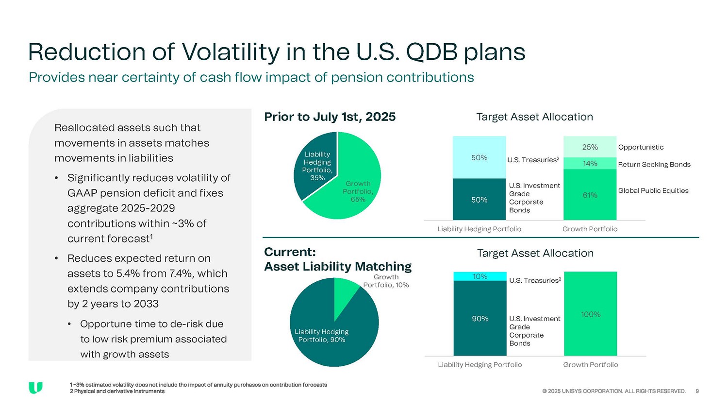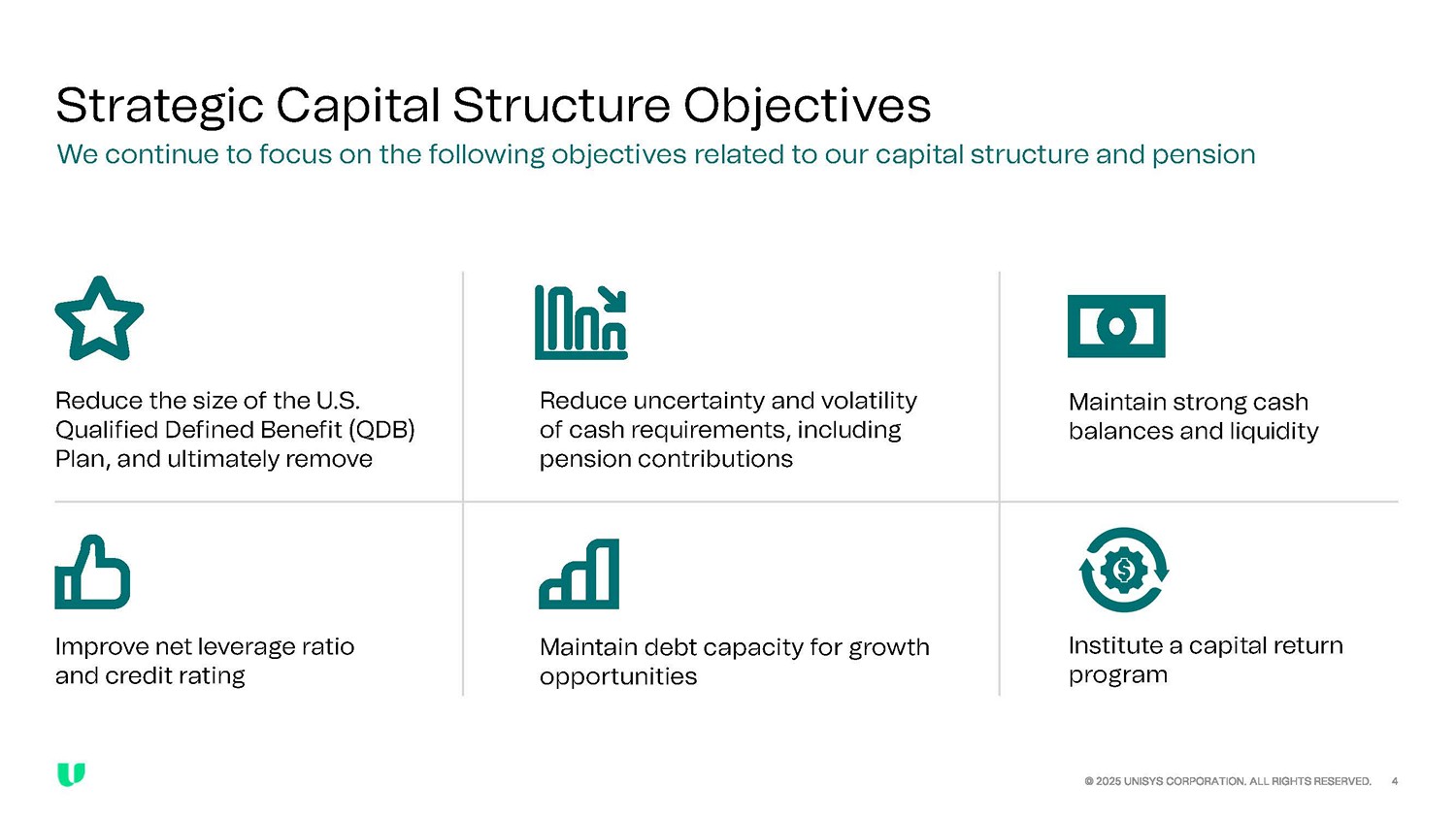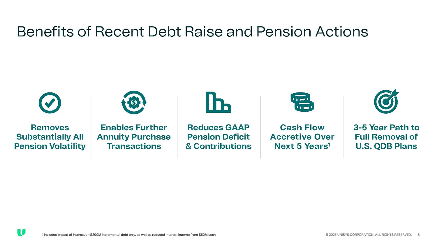 Steps We Have Taken… © 2025 UNISYS CORPORATION. ALL RIGHTS RESERVED. 5 Issued new $700M notes Refinanced $485M notes Extended Asset - Backed Revolver Maturity Contributed $250M to U.S. QDB plan Reallocated U.S. QDB Plan Assets …Next Steps Increase Capacity to Fund Cost of Full Removal Execute Annuity Purchases to Reduce Cost of Full Removal of U.S. QDB Plans 1 2