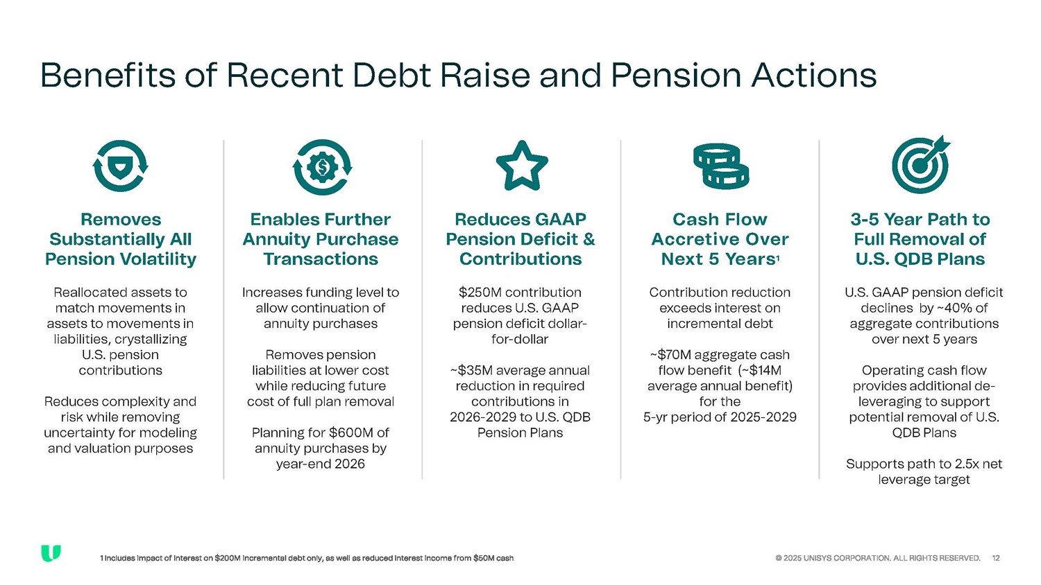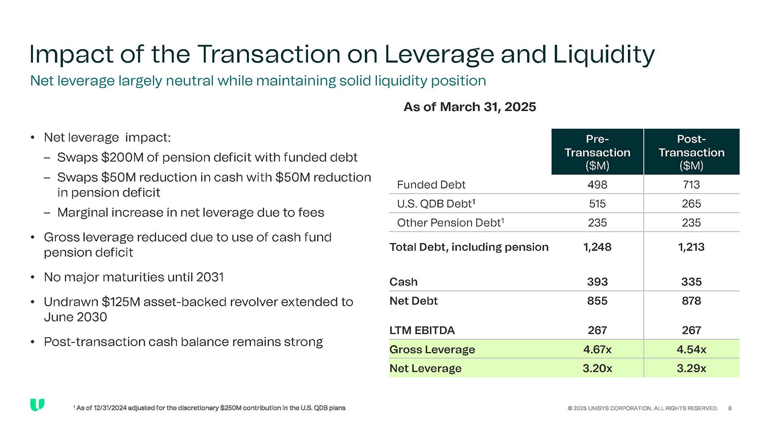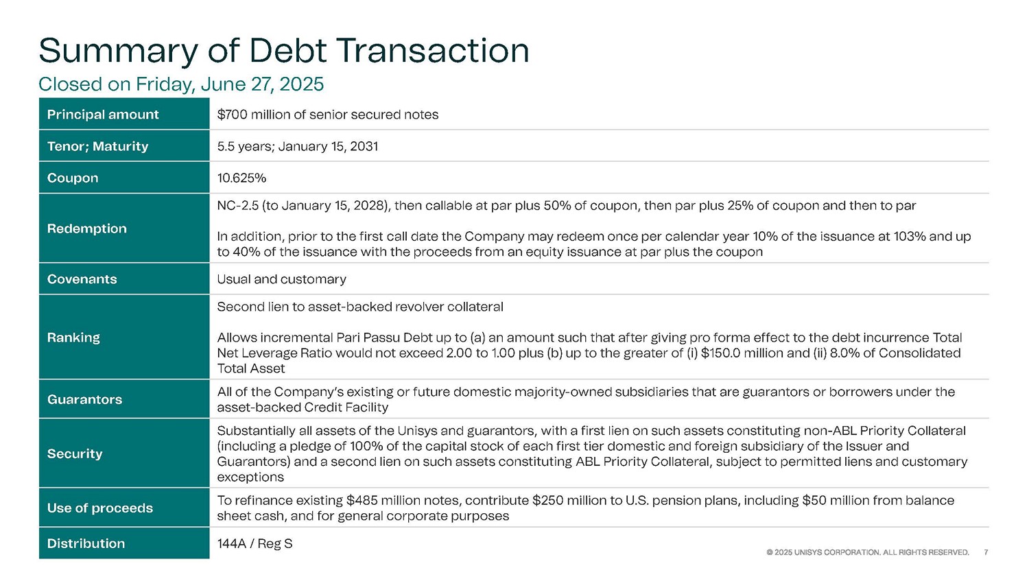 Summary of Debt Transaction Closed on Friday, June 27, 2025 $700 million of senior secured notes Principal amount 5.5 years; January 15, 2031 Tenor; Maturity 10.625% Coupon NC - 2.5 (to January 15, 2028), then callable at par plus 50% of coupon, then par plus 25% of coupon and then to par In addition, prior to the first call date the Company may redeem once per calendar year 10% of the issuance at 103% and up to 40% of the issuance with the proceeds from an equity issuance at par plus the coupon Redemption Usual and customary Covenants Second lien to asset - backed revolver collateral Allows incremental Pari Passu Debt up to (a) an amount such that after giving pro forma effect to the debt incurrence Total Net Leverage Ratio would not exceed 2.00 to 1.00 plus (b) up to the greater of ( i ) $150.0 million and (ii) 8.0% of Consolidated Total Asset Ranking All of the Company’s existing or future domestic majority - owned subsidiaries that are guarantors or borrowers under the asset - backed Credit Facility Guarantors Substantially all assets of the Unisys and guarantors, with a first lien on such assets constituting non - ABL Priority Collateral (including a pledge of 100% of the capital stock of each first tier domestic and foreign subsidiary of the Issuer and Guarantors) and a second lien on such assets constituting ABL Priority Collateral, subject to permitted liens and customary exceptions Security To refinance existing $485 million notes, contribute $250 million to U.S. pension plans, including $50 million from balance sheet cash, and for general corporate purposes Use of proceeds 144A / Reg S Distribution