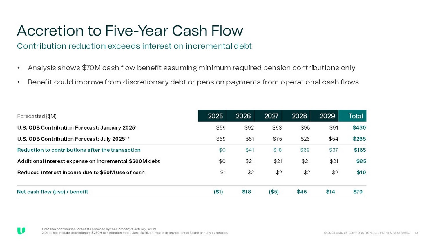 Accretion to Five - Year Cash Flow Contribution reduction exceeds interest on incremental debt • Analysis shows $70M cash flow benefit assuming minimum required pension contributions only • Benefit could improve from discretionary debt or pension payments from operational cash flows Total 2029 2028 2027 2026 2025 $M $430 $91 $95 $93 $92 $59 U.S. QDB Contribution Forecast: January 2025 1 $265 $54 $26 $75 $51 $59 U.S. QDB Contribution Forecast: July 2025 1.2 $165 $37 $69 $18 $41 $0 Reduction to contributions after the transaction $85 $21 $21 $21 $21 $0 Additional interest expense on incremental $200M debt $10 $2 $2 $2 $2 $1 Reduced interest income due to $50M use of cash $70 $14 $46 ($5) $18 ($1) Net cash flow (use) / benefit