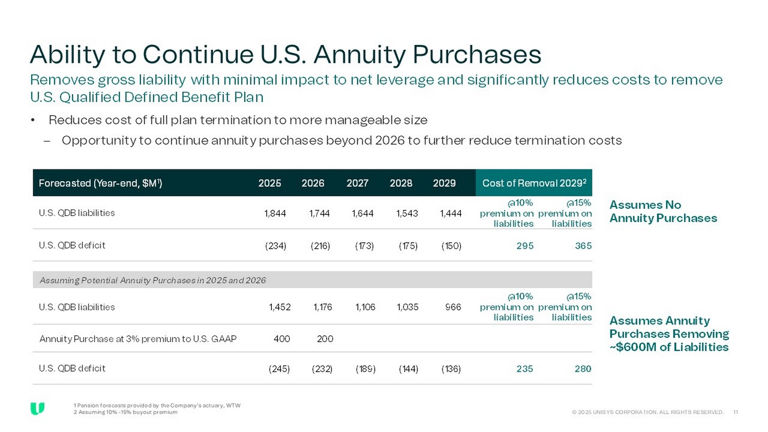 Ability to Continue U.S. Annuity Purchases Removes gross liability with minimal impact to net leverage and significantly reduces costs to remove U.S. Qualified Defined Benefit Plan • Reduces cost of full plan termination to more manageable size – Opportunity to continue annuity purchases beyond 2026 to further reduce termination costs Cost of Removal 2029 2 2029 2028 2027 2026 2025 Year - end, $M 1 @15% premium on liabilities @10% premium on liabilities 1,444 1,543 1,644 1,744 1,844 U.S. QDB liabilities 365 295 (150) (175) (173) (216) (234) U.S. QDB deficit Assuming Potential Annuity Purchases in 2025 and 2026 @15% premium on liabilities @10% premium on liabilities 966 1,035 1,106 1,176 1,452 U.S. QDB liabilities 200 400 Annuity Purchase at 3% premium to U.S. GAAP 280 235 (136) (144) (189) (232) (245) U.S. QDB deficit Assumes No Annuity Purchases Assumes Annuity Purchases Removing ~$600M of Liabilities